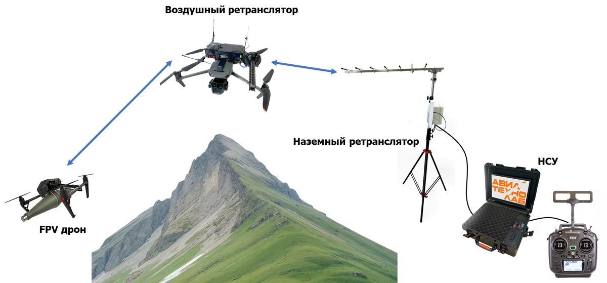 Полноценная система ретрансляции включает три узла: Наземная станция управления (НСУ) - Воздушный ретранслятор на БПЛА (Воздушный РТР) - Боевой дрон (камикадзе).