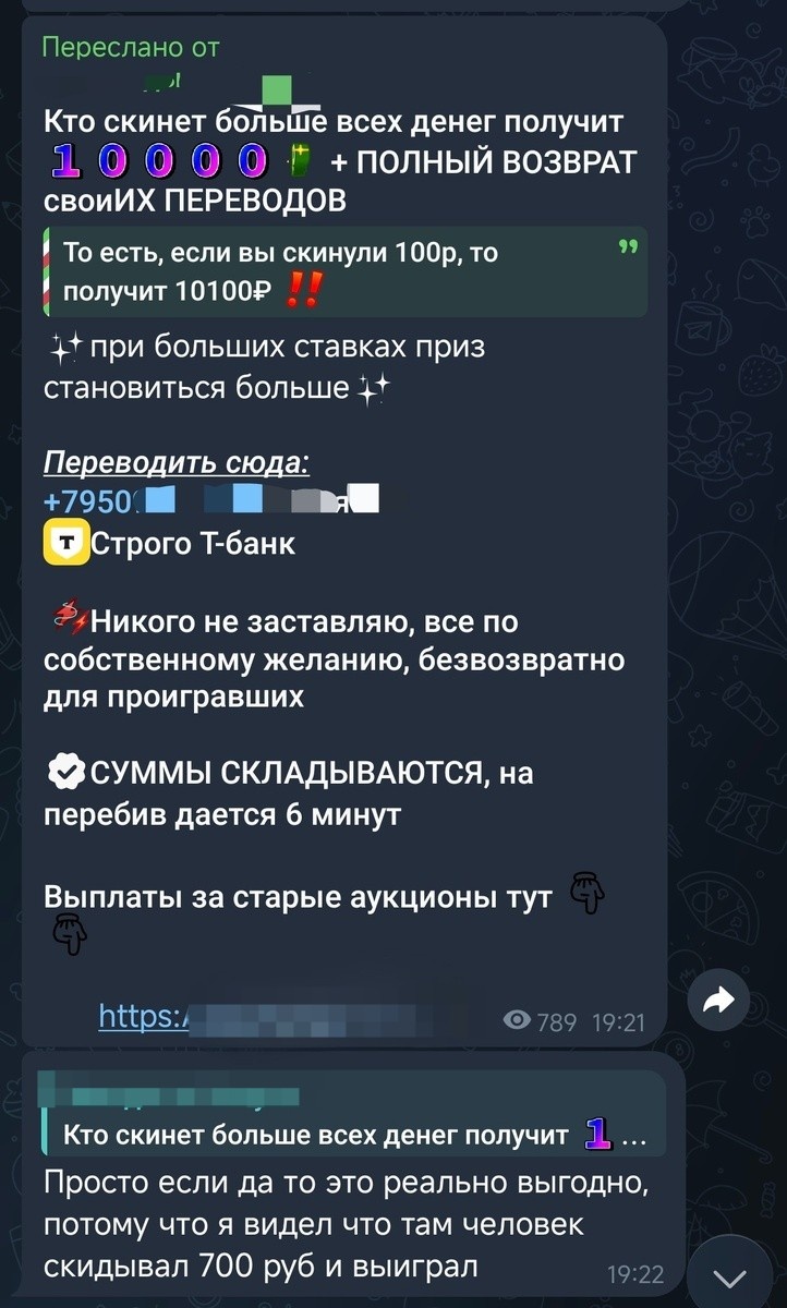 В тех же чатах появляются сообщения: «Я видел, там человек скинул 700 рублей и выиграл». Иногда это реальные люди, которых тоже обманули. Иногда — подставные аккаунты организатора.