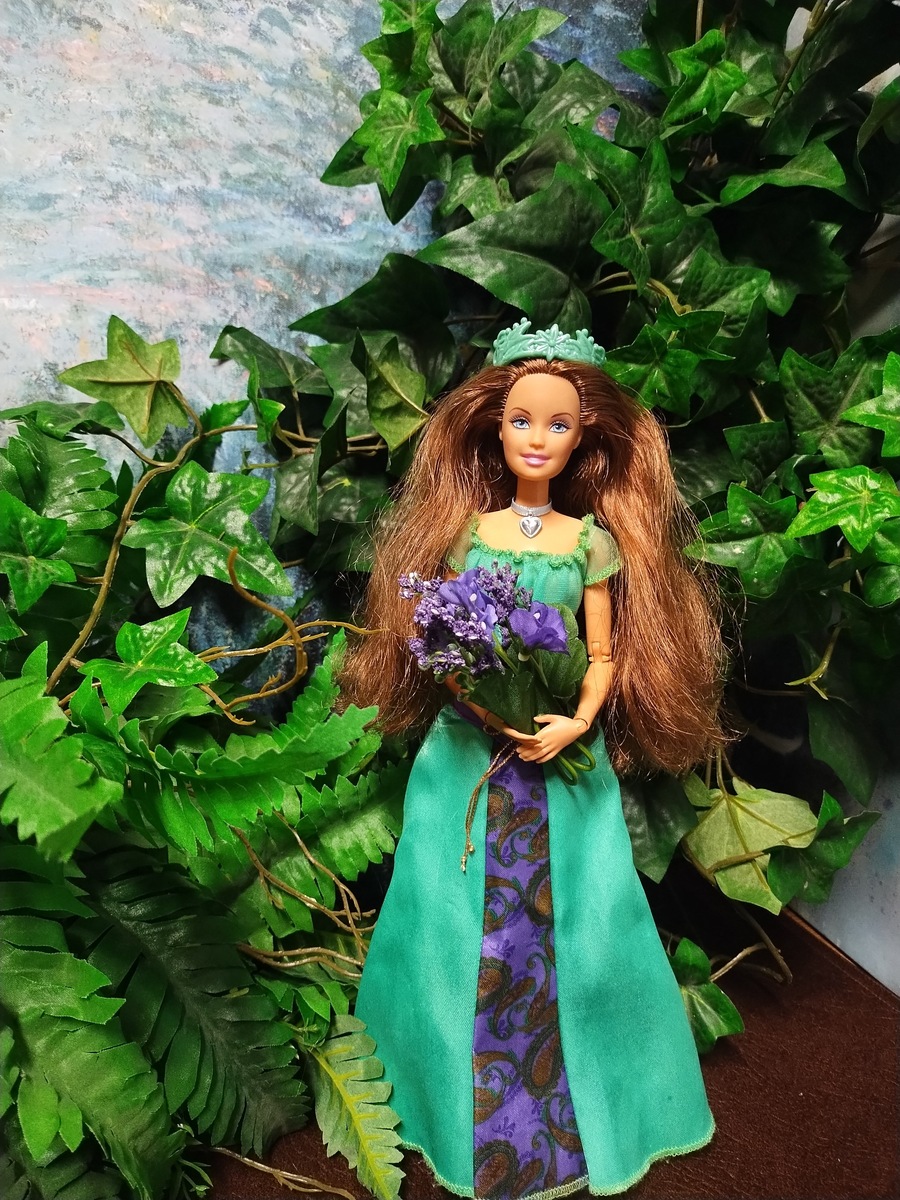 Всем доброго дня! Сегодня будет мало рассказов - а только красивые картинки. Волшебная, загадочная, очаровательная Барби в образе Королевы леса. Я назвала ее - Лесная Фея. Это очень красивая кукла Барби на молде Generation girls. У нее длинные роскошные каштановые волосы. Синие бездонные глаза. И нежная улыбка. Платье и корону мы позаимствовали у другой куклы, - но нашей героине они подошли идеально. Встречаем!- Барби Лесная Фея ************************************************************************ ******************************************************************** На шее у Барби также ленточка с кулончиком в виде сердечка ***************************************************************************** ******************************************************************* ************************************************************************ ************************************************************************ С букетом синих лесных цветов ******************************************
