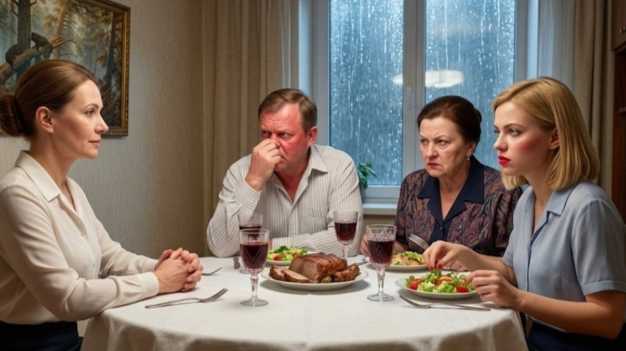 Запах запеченного мяса с чесноком плыл по квартире, тяжело оседая на шторах и плотной обивке мебели. Он смешивался с ароматом густого, удушливо-сладкого парфюма Светы, который она всегда наносила слишком щедро. За столом в нашей небольшой гостиной было откровенно тесно. Я специально раздвинула старый советский стол-книжку, накрыла его плотной накрахмаленной скатертью. Звякали тяжелые мельхиоровые вилки о фарфоровые тарелки, в граненых хрустальных бокалах искрился темно-бордовый гранатовый сок. Обычный воскресный ужин. По крайней мере, именно так мне сказал муж сегодня утром, когда попросил приготовить что-нибудь особенное. Для мамы и сестры.