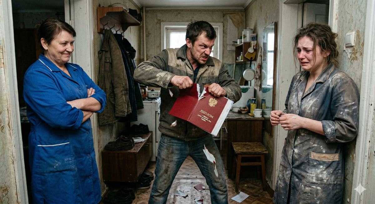 Я стояла в прихожей нашего дома в Прокопьевске, прислонившись плечом к холодному косяку. От меня пахло хлоркой и чуть кисловатым сырым творогом — обычный запах после двенадцатичасовой смены на молочном заводе. В руках я держала диплом. Красный. Плотный картон, золотое тиснение. Пять лет ночных бдений над учебниками, пока Артём спал, а свекровь, Галина Петровна, ворчала на кухне, что я «сжигаю казённое электричество».