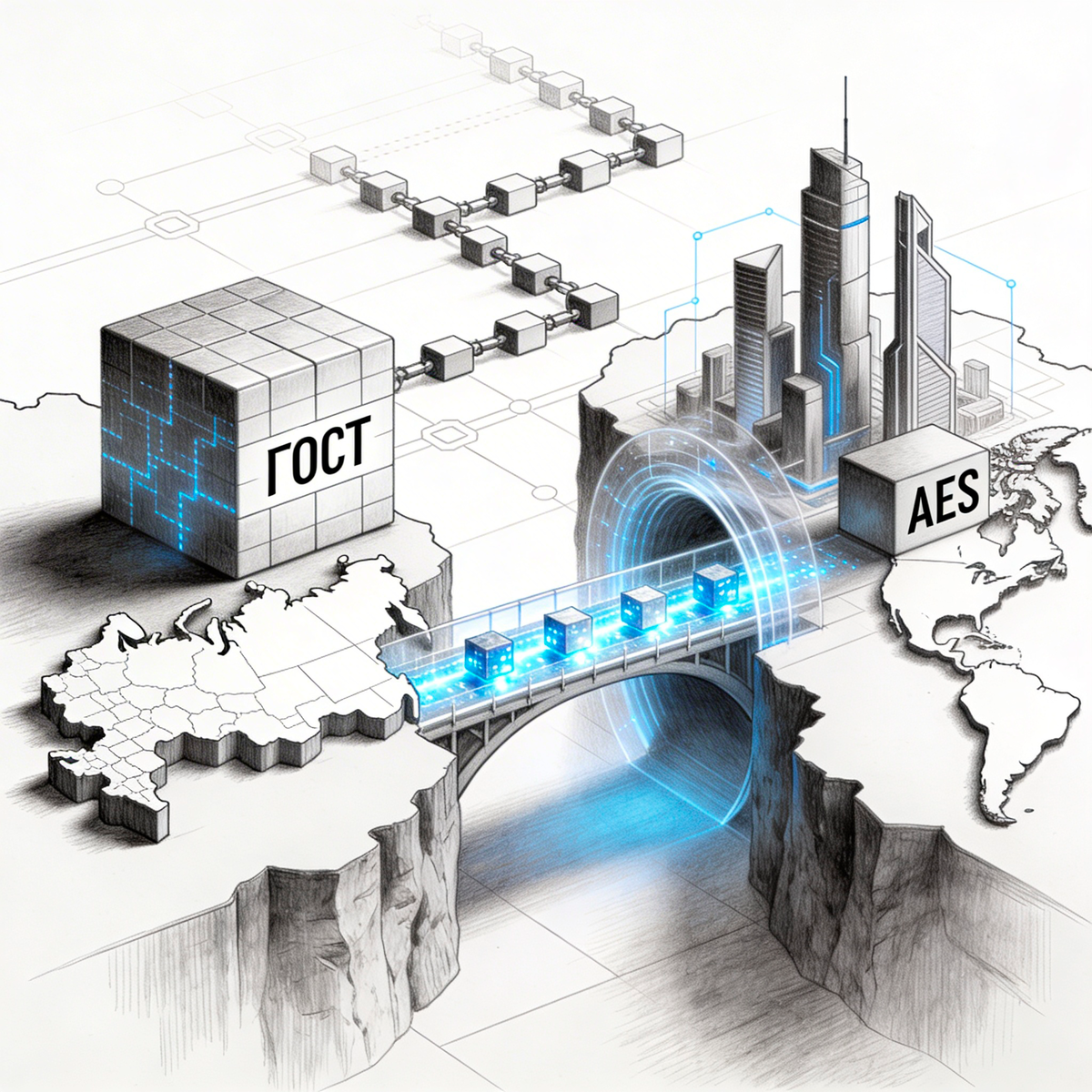 ГАНИМЕД* использует разные стандарты шифрования для разных контуров и строит «кросс‑мост» на границе юрисдикций, чтобы сохранить совместимость с миром и выполнить требования внутри РФ.