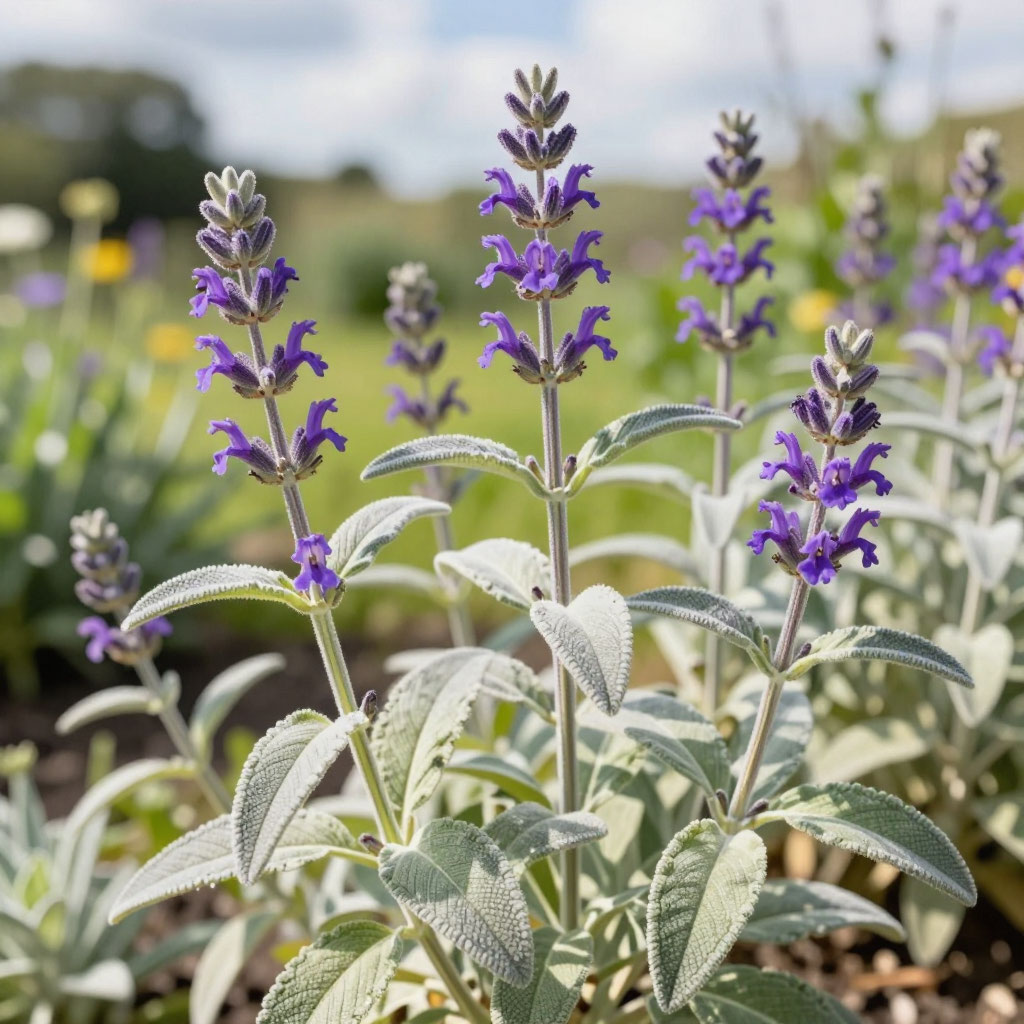 Свечи шалфея создают вертикальные акценты в цветнике. Его сине-фиолетовые соцветия выглядят благородно и дорого. Шалфей предпочитает легкие, сухие почвы и полное солнце. Он обладает пряным ароматом, который усиливается в жаркий день, отпугивая вредителей от соседних растений.