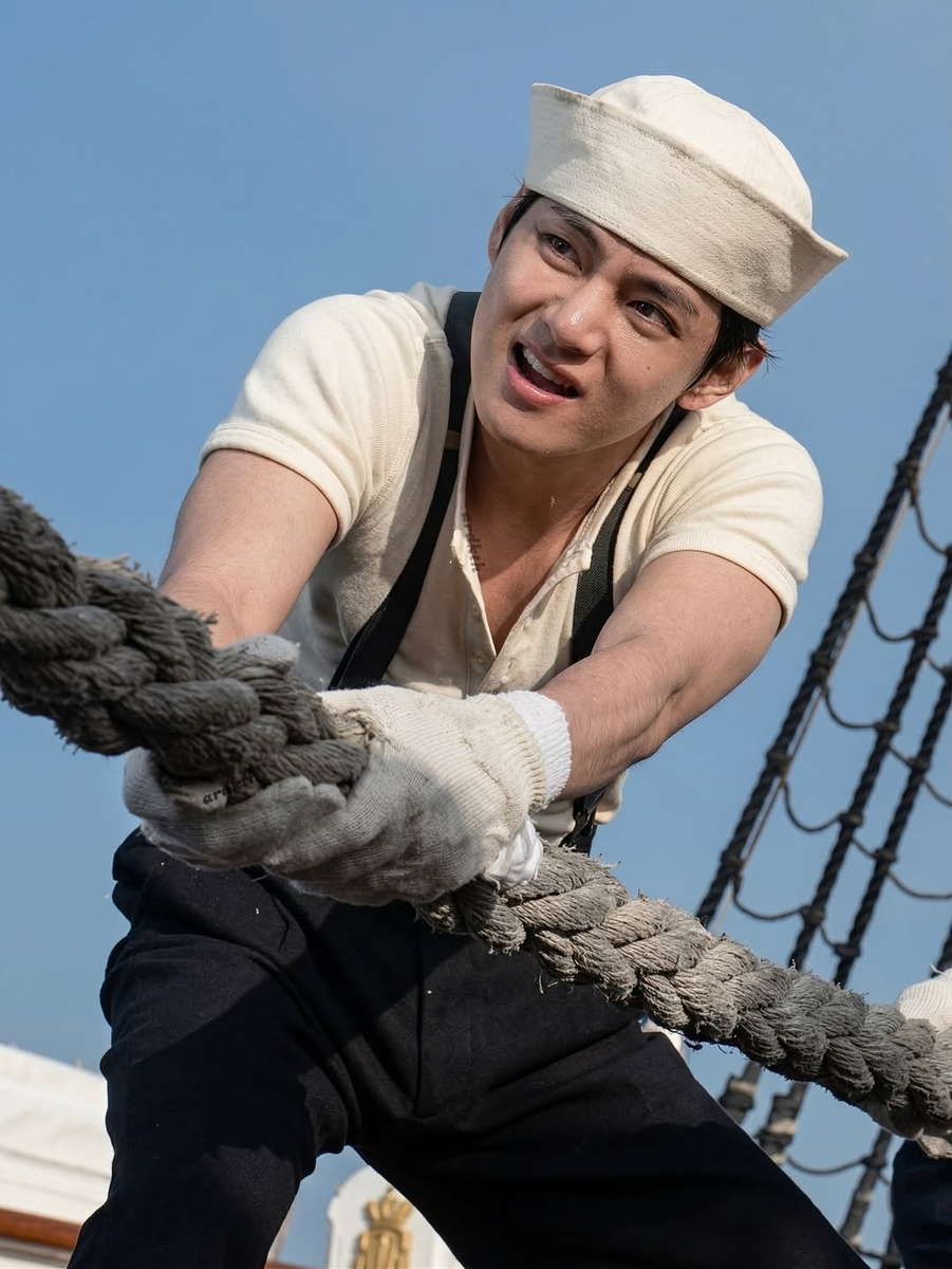 Начнём с образа, который сразу бросается в глаза: Тэхён-матрос. Он стоит, напряжённо вцепившись в канат, сжав зубы, с выражением лица, полное неистовой борьбы. Это не просто образ.