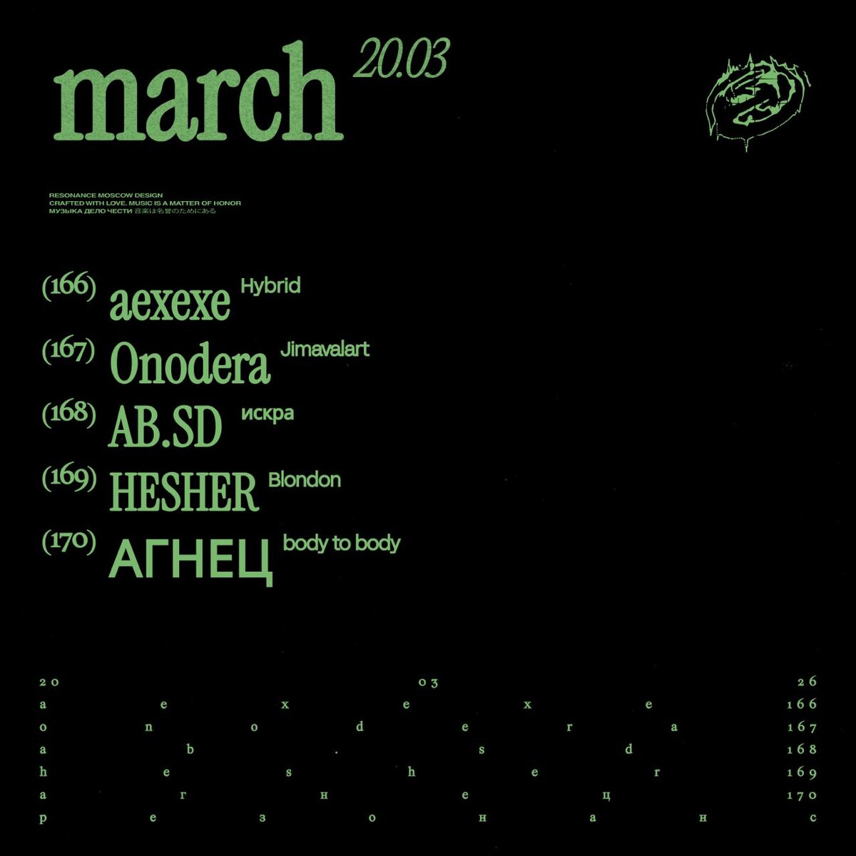aexexe — Hybrid Погружение в футуристическое техно‑пространство. В основе трека — плотный и гипнотичный ритм, но его оживляют редкие аналоговые синтезаторы с теплым, почти «живым» звучанием, и фрагементы полевых записей. Onodera — Jimavalart Электронный музыкант и диджей продолжает музыкальный нарратив в соединении электронной музыки и грузинских мотивов. В центре звука — привычный для продюсера контраст теплого винилового сэмпла и холодного отстраненного бита. AB.SD — VOID Напряженный техно-трек, построенный на плотном груве и постепенном развитии. Сухая ритмика и глубокий кик задают устойчивый пульс, вокруг которого медленно разворачиваются текстуры и короткие синтовые сигналы. HESHER — Blondon Трек с динамичными брейк-битами и этническими звуковыми элементами, где вокальные вставки и звучание отсылают к британской рейв-культуре. Его энергия агрессивна и драйвова, с резкими ударными и многослойными текстурами. АГНЕЦ — body to body Наш резидент АГНЕЦ представляет новую работу