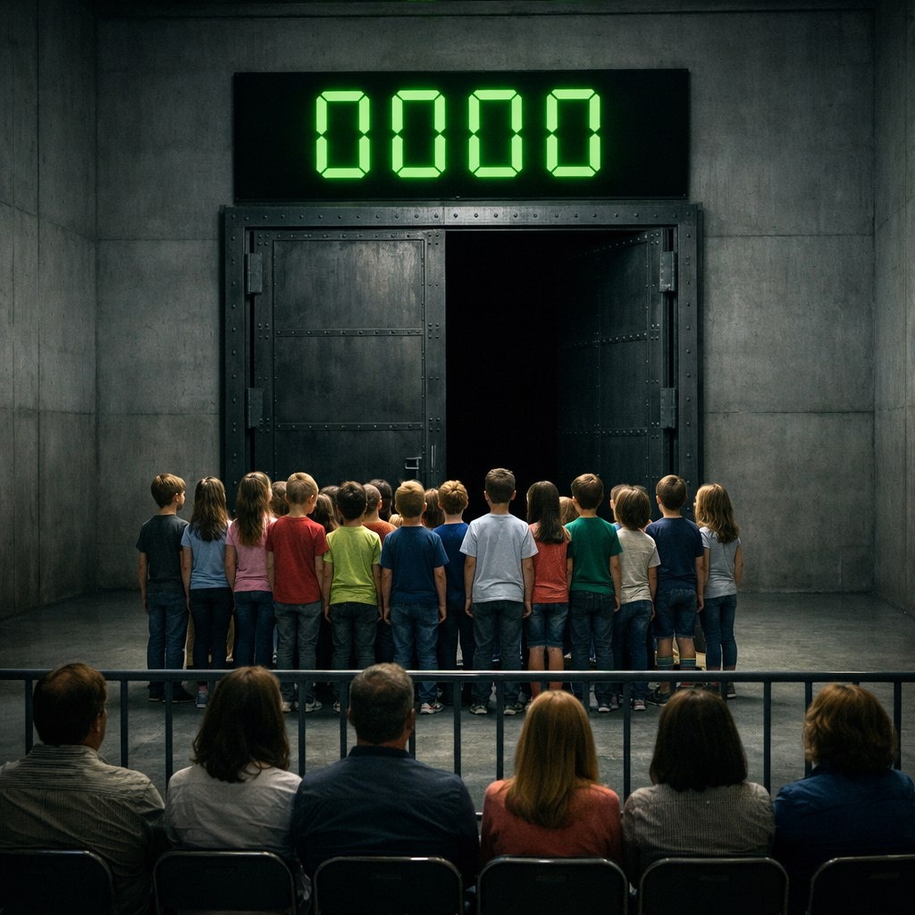 Словно в замедленной съёмке, дети, бегущие к выходу, после окончания счёта времени, поочереди падают прямо около ворот. Датчик в их ошейниках сработал мгновенно - послав импульс тока в мозг. Они падают, словно куклы, с пустыми, открытыми глазами. Звук удара голов о землю - тонет в плаче родителей и аплодисментах.