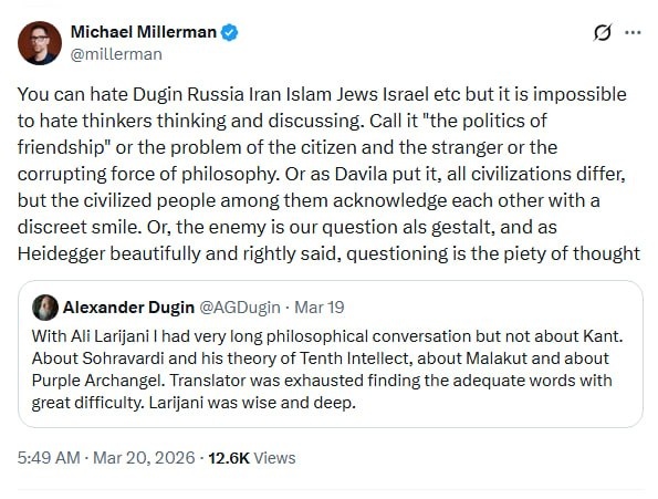 Heidegger conversations with Paul Celan or with Jacob Taubes. I had also extremely and multiple conversations with fundamentalist Israeli rabbi on Guénon and the King of the world. The philosophy is the special level of the reality that is far beyond the mediocrity. — Alexander Dugin https://dzen.ru/id/641c62de8f2fb34cd94d5713