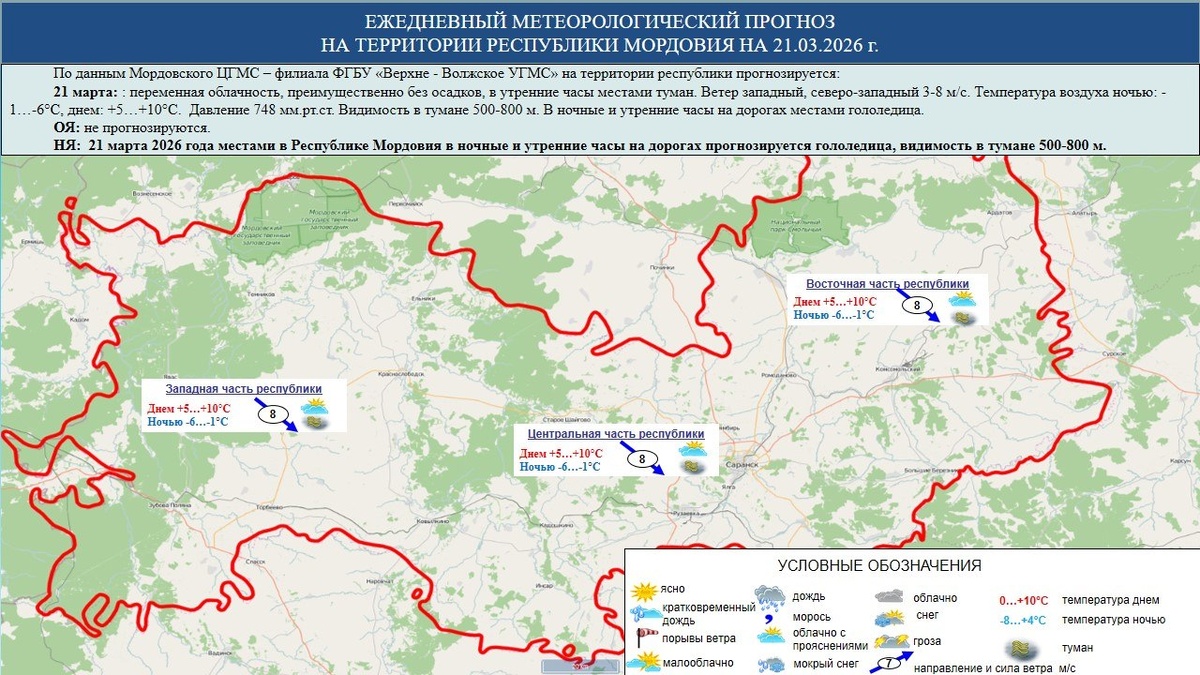 ☁️⛅⛈️ 21 марта в Мордовии переменная облачность, преимущественно без осадков, в утренние часы местами туман с видимостью 500-800 м