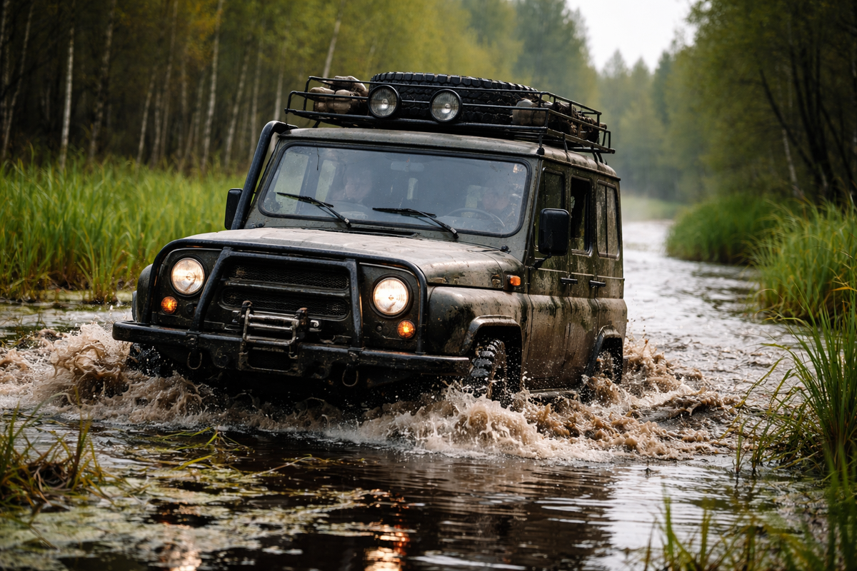 УАЗ — классика отечественных болот. Лёгкий, ремонтопригодный, запчасти везде. Но требует серьёзной доработки: лифт подвески, резина, лебёдка.