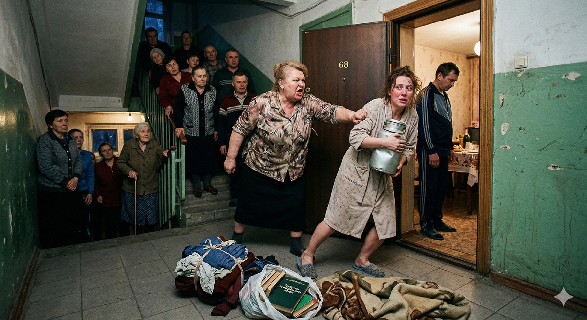 Я стояла на кафельном полу подъезда, и холод пробирался сквозь тонкие тапочки. У моих ног уже громоздились узлы с одеждой, старая алюминиевая фляга, которую я притащила с завода под рассаду, и пакет с моими книгами. Из пакета торчал корешок справочника по микробиологии молока — моя жизнь, упакованная в полиэтилен.