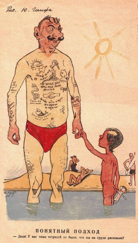 Юлий Ганф (1898—1973). 1934. «Понятный подход. — Дядя! У вас тоже тетрадей не было, что вы на груди рисовали?» Сатира автора метила сразу в два явления — татуировки и недостаток в продаже школьных тетрадей