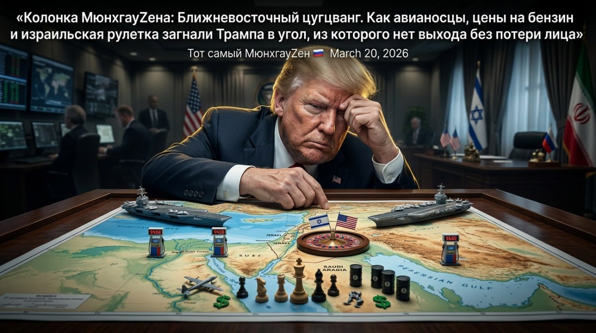 🚨 Колонка МюнхгауZена: Ближневосточный цугцванг. Как авианосцы, цены на бензин и израильская рулетка загнали Трампа в угол, из которого нет выхода без потери лица Тишина над Суэцким каналом — обманчивая. Вчера днём тяжёлые воды канала приняли в свои объятия стального гиганта — авианосец «Джеральд Форд». Он шёл не под фанфары, не под приветственные крики, а под аккомпанемент тревожных слухов, густым роем облепивших его переход. Официальная версия: на борту случился пожар в прачечной, кораблю требуется текущий ремонт на Крите. Неофициальная — та, что шепчут в кулуарах Пентагона и множат в зарубежных телеграфах — куда страшнее. Иранский дрон? Ракетный удар? Или умышленный поджог, устроенный теми, кто устал от бесконечной вахты? Фотографии прохода «Форда» по каналу не дают ответа: корпус цел, надстройки не тронуты. Но моряки знают: иногда самые опасные раны остаются внутри. Усталость экипажа, доведённого до предела десятью месяцами непрерывной боевой службы, — вот истинный огонь, который