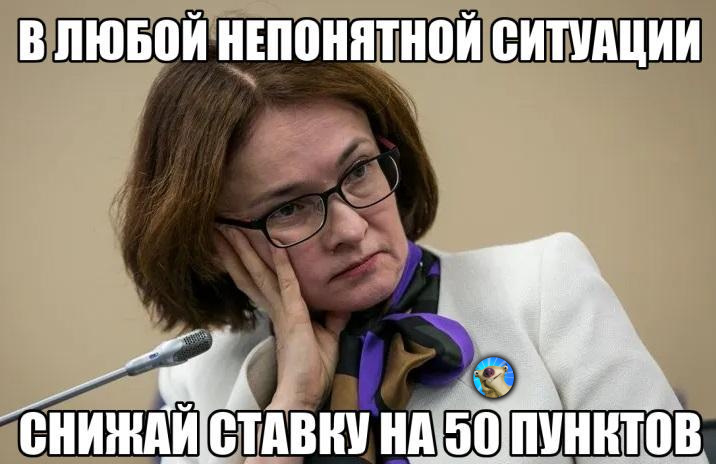 Так и сказала: мол, думали даже 100 пунктов вниз лупануть, но конфликт очень сильно ударяет по мировой логистике, и если мы получаем плюс от дорогой нефти, то очень много теряем на мировой инфляции. Блин, как будто вывод из моего утреннего пятничного поста озвучила! Горжусь, что мои дурацкие мысли так неплохо сходятся с мыслями главы регулятора.