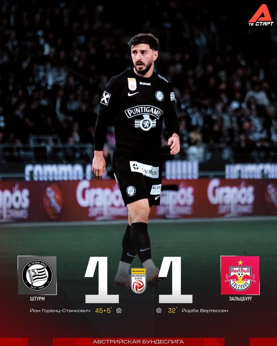 «Штурм» и «Зальцбург» обменялись голами в первом тайме, на том и разошлись – 1:1. Смотрите австрийскую Бундеслигу на телеканалах «Старт» и платформе TVSTART.RU 🖥 Подписывайся на ТВ СТАРТ в MAX📲