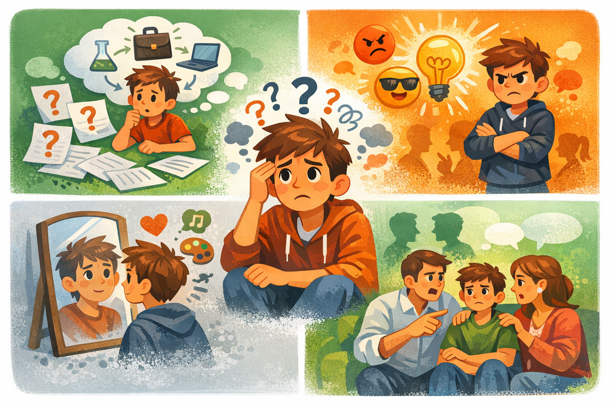 Чтобы помочь с выбором профессии, сначала нужно понять глубинные причины из-за которых подростку бывает трудно определиться с будущим. Тогда вам будет гораздо легче понять, на что делать акцент в разговоре об образовании и профессии. Подростку трудно удерживать в уме сразу несколько параметров: что это за профессия, что в ней нужно уметь, подходит ли она ему, нравится ли такой образ жизни, какие есть другие варианты и что будет дальше. Он может быстро перескакивать, путаться, не любит длинные разговоры про будущее, отвечает обрывочно. Подросток избегает разговоров о будущем, отвечает «не знаю», раздражается, хватается за первую яркую идею, быстро меняет решения. Может ненадолго успокаиваться, когда называет какую-то профессию, а потом снова искать новое. Подросток называет профессии, но не может объяснить, почему они ему подходят. Ему трудно сказать, что ему интересно, что у него получается, что для него важно, в какой среде ему комфортно, какой он вообще человек. Подросток делает выбо