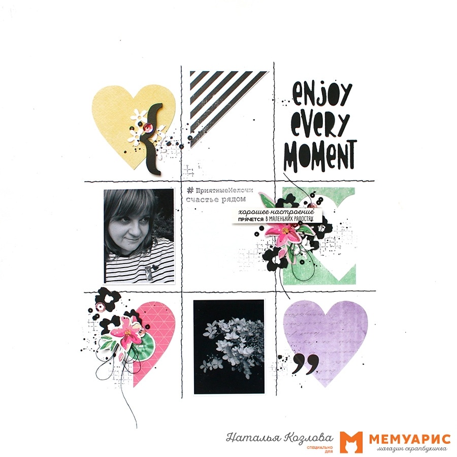 Привет, привет! С вами Наташа и сегодня я буду вас вдохновлять на участие в нашем задании «Пора по парам». Мне безумно понравилась его идея! Не скажу что парные странички для меня что-то новое, уже пару раз я делала подобное. Но почему бы не сделать еще раз и немного по-другому?! ))) По условиям задания странички будут объединены цветовой гаммой и повторяющимися элементами. Но при этом скетчи и идеи совершенно разные. Давайте же наконец посмотрим на них… Первая. И тут вы можете видеть сетку их фотографий и различного декора. Сердечки я вырезала из бумаги от Scrapмир и Scrapodelie, коллекций "Сиреневый рассвет" и “Шёпот листопада". Из декоративных элементов у меня яркие вырезанные цветы от Polkadot и вырубленные из белого и черного кардстока ножами Mimi cut "Когда расцветает земля". И вторая страничка. Теперь вы можете увидеть всю картину, объединяет эти странички сердечная тема )) На первой сердец много, а здесь одно большое. Пробежимся ещё по общим элементам. Это конечно заголовок. И