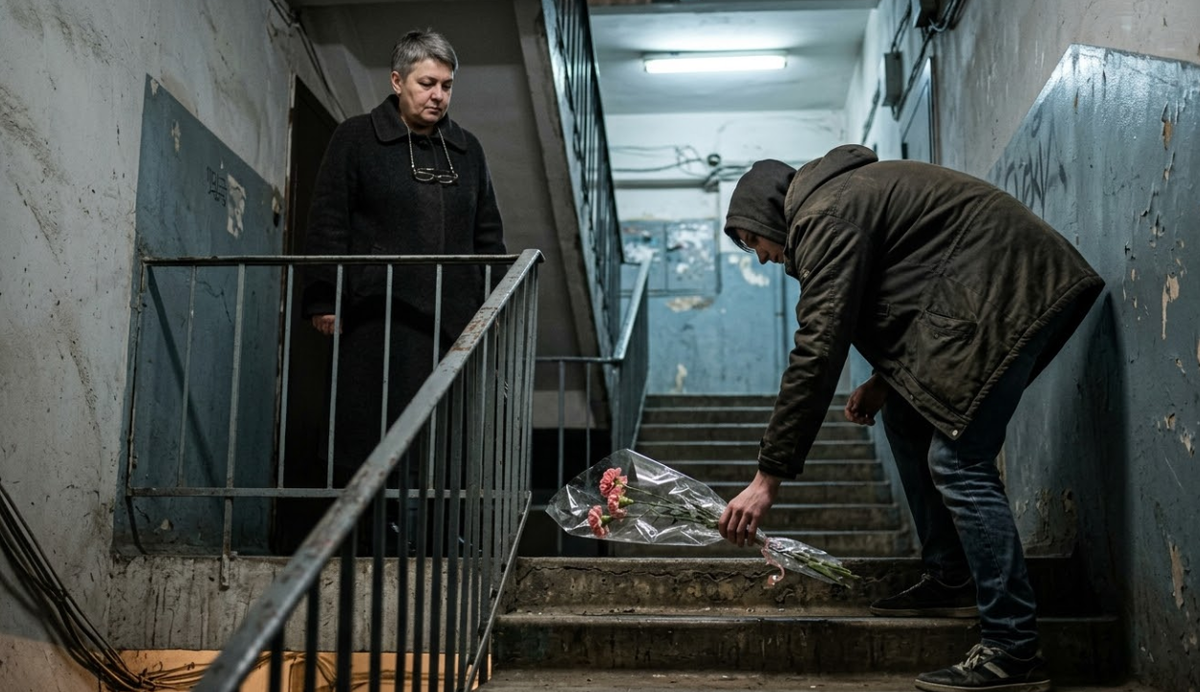Подъезд. Лампочка мигает. На ступеньке — три гвоздики в целлофане, розовые, мятые.