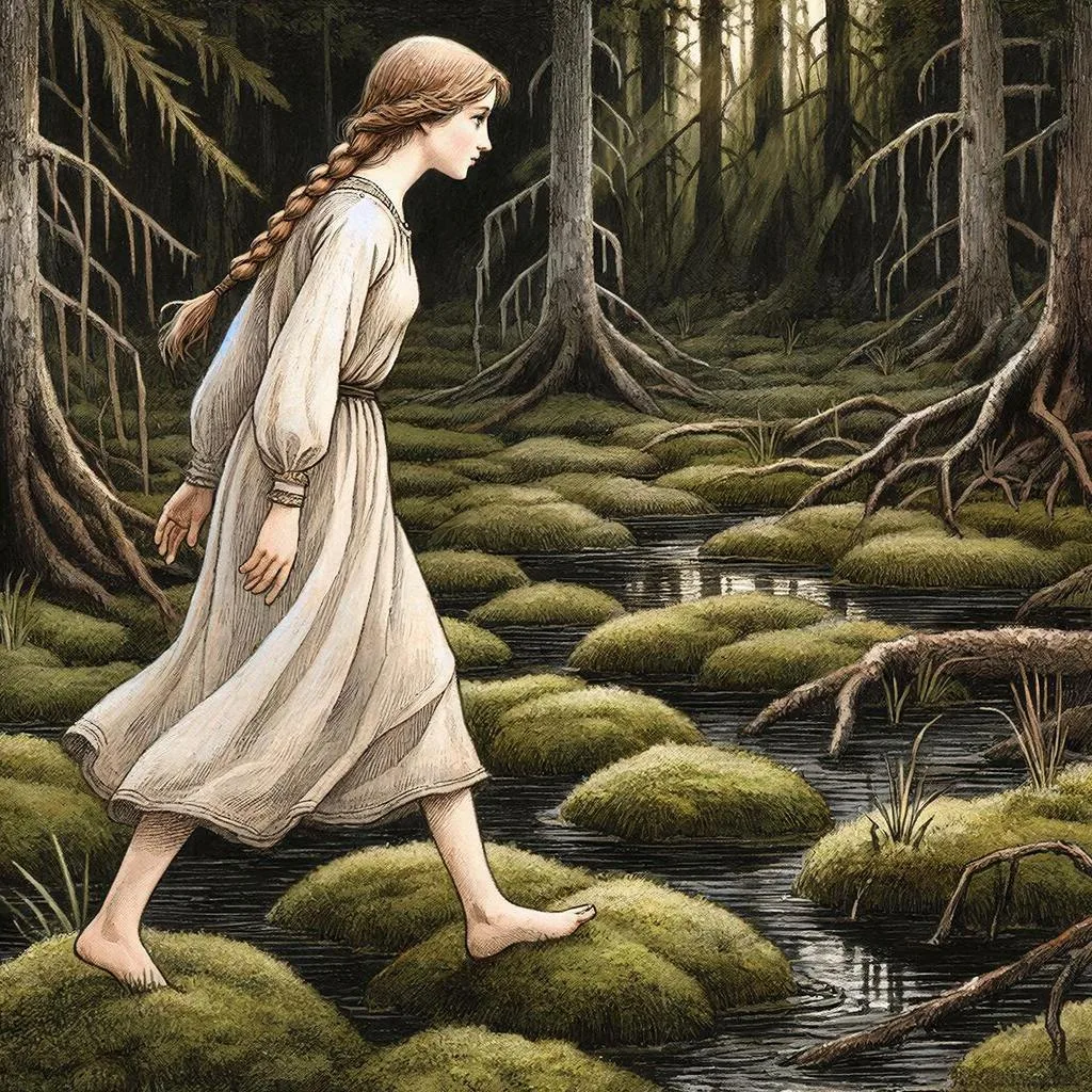 Мягко прогибается мох под ногами — пружинистый, древний, впитывающий каждый шаг, не давая ему разорвать лесную тишину. Маша идёт по болоту, ступает туда, куда редко ступает человеческая нога, туда, где земля дышит иначе, чем на твёрдой почве, где вода прячется под кочками и корнями, где даже воздух кажется гуще, тяжелее, пропитанный запахом мха, багульника и той особенной, сырой древностью, что живёт в таких местах века. Она идёт легко, несмотря на трясину, ноги сами находят твёрдые кочки, обходят зыбкие места, и кажется, что сама топь узнаёт её, пропускает, не держит.