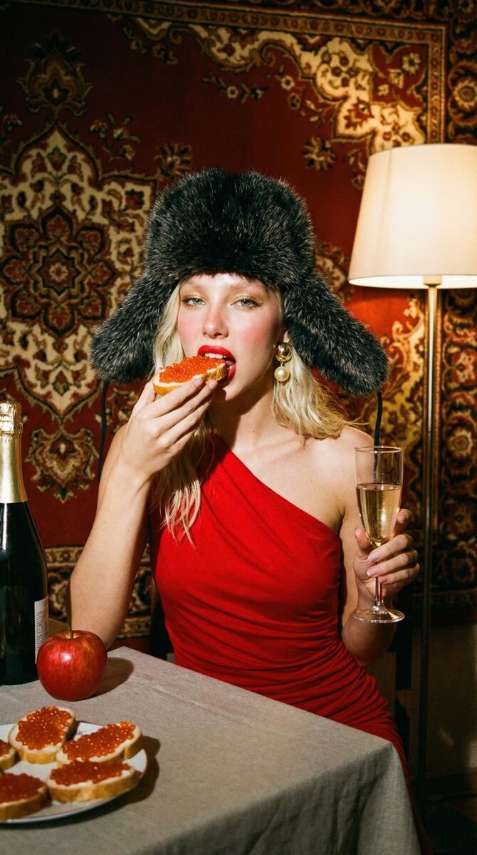 📸: ✨ отправь свое фото в бот https://t.me/aibudka_bot (лицо чётко видно) ✨ выбери Nano Banana Pro (обязательно поставь ползунок на pro для топ результата) ✨ параметры: 2K или 4К, 9:16 ✨ скопируй и вставь этот промпт: Сохрани лицо с загруженного фото. Не меняй лицо. Сходство 100%. Фэшн-снимок на плёнку со вспышкой, формат 9:16. Девушка сидит за столом, покрытым простой скатертью, кусает бутерброд с красной икрой, в другой руке бокал шампанского. На голове большая тёмная меховая шапка-ушанка. Волосы распущены под шапкой. Макияж: красная помада, румяна, золотистые тени. Крупные золотые серьги с жемчугом. Красное платье с одним открытым плечом, драпировка. На столе — бутылка шампанского, красное яблоко, тарелка с бутербродами с икрой. Фон — стена полностью закрыта советским ковром с красно-бежевым орнаментом, торшер с тёплым светом. Жёсткая вспышка, плёночное зерно, тёплые красно-коричневые тона. Настроение — ироничный русский гламур, rich but absurd. #иифотосессия #лакшери #ужин