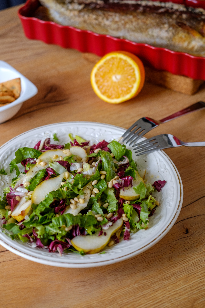 100 г салатной смеси (у меня фризе, радичио и романо)