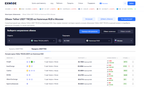 Для выбора надежного криптообменника в Москве на наличные рубли удобно пользоваться мониторингом Exnode, где собран список проверенных вариантов, актуальные курсы, резервы и отзывы пользователей. Это позволяет сделать обмен максимально безопасным и выгодным.