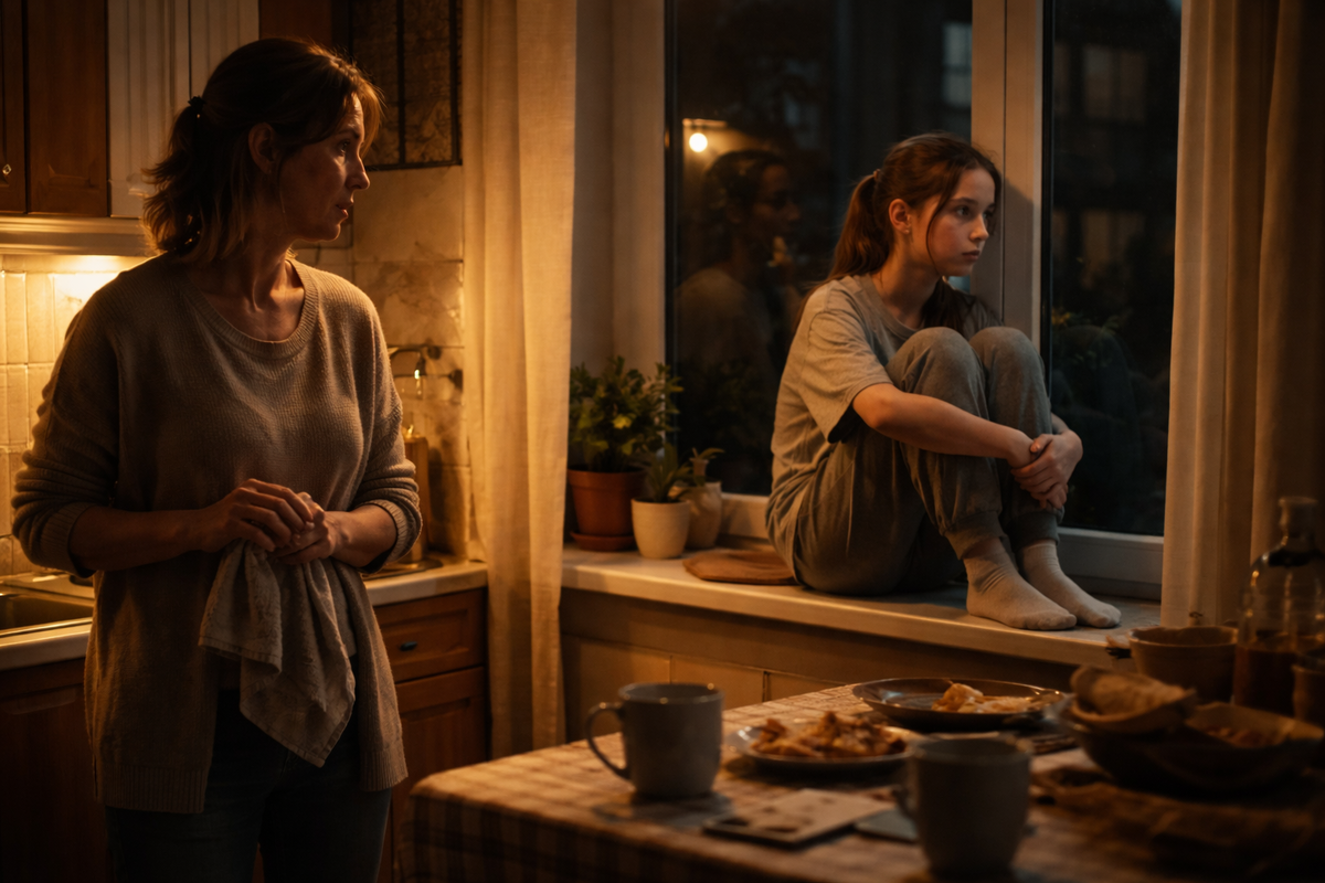 Она сидела на подоконнике, подтянув колени к груди. Уже не маленькая, чтобы болтать ногами, и ещё не взрослая, чтобы скрывать всё лицо за выражением “ничего”. Тонкая, длинная, в растянутой футболке, с волосами, собранными кое-как. Она смотрела не на меня, а в окно, где в чёрном стекле отражалась наша кухня: я, тряпка, жёлтый свет и её острые коленки.