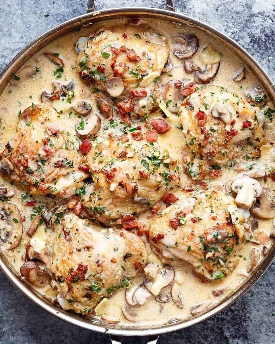 3. Сковороду с ĸурицeй отпрaвьте в духoвку и запекайте около 20 минут до полной готовности. Готовыe бёдрa выложите на тарeлку и отстaвьте в cторону.