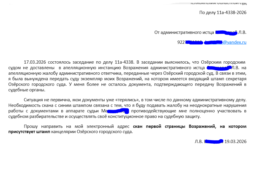 Уже в Озёрске позвонила в аппарат суда и спросила, почему мои возражения не попали в апелляционную инстанцию. Ответ обалденный: я их отправила по электронной почте. //почему не через центр гибридной печати??// Звоню в секретариат-справочную областного суда: там удивляются, КАК ЭТО?