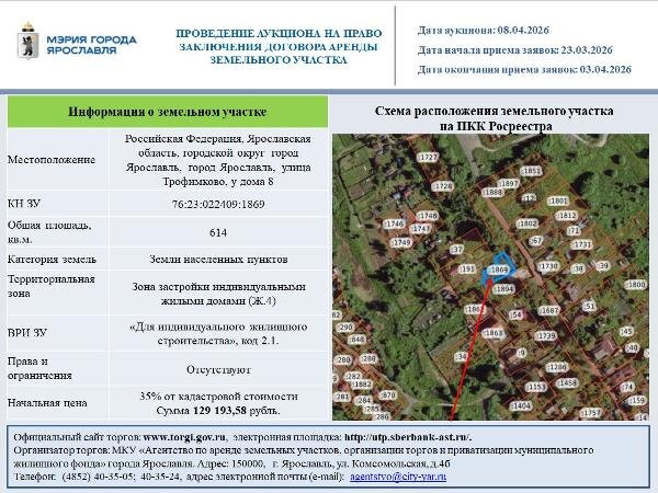 Название: Российская Федерация, Ярославская область, городской округ город Ярославль, город Ярославль, улица Трофимково, у дома 8 Канал: Госземля Ярославская область Область: обл Ярославская Район: г.о. город Ярославль Населенный пункт: г Ярославль улица Трофимково, у дома 8 Локация: Смотреть на карте ВРИ: Для индивидуального жилищного строительства Кадастровый номер: 76:23:022409:1869 Кадастровая стоимость: - Вид сделки: Аренда Площадь: 614 м² Начальная цена: 129193.00 руб. Дата завершения: 03.04.2026 Подробнее: ГИС ТОРГИ #госземля #земляотгосударства #земля #земельныйучасток #земельныеторги #торги #аукцион #арендаземли #аренда #ярославскаяобласть