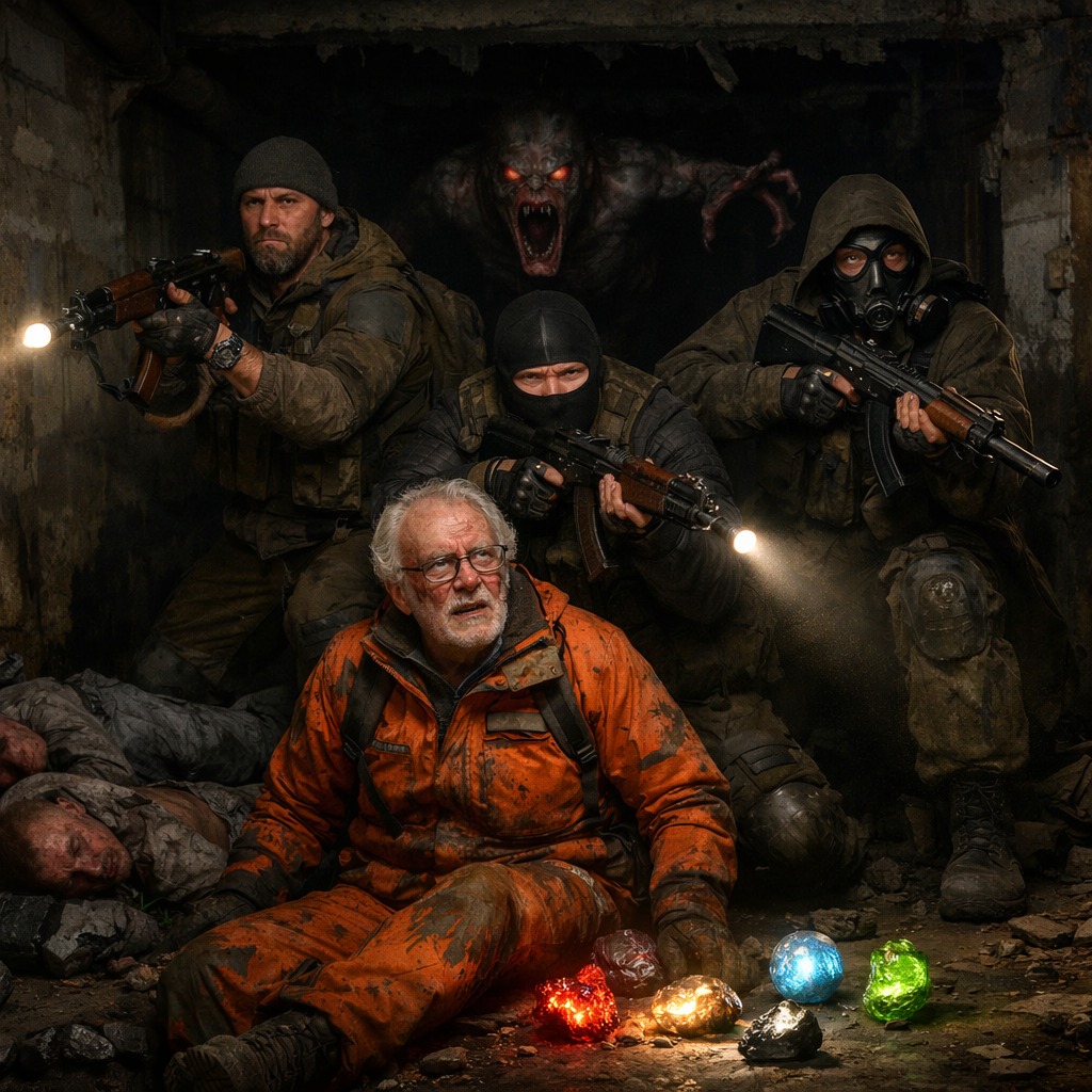 Но самое удивительное ждало их в самом дальнем, мрачном углу подвала. Там, среди хлама и пыли, сидел старик в измазанном оранжевом комбинезоне ученого. Это был профессор Сахаров, известный ученый, чьи экспедиции в аномальные зоны часто приводили сталкеров к неслыханным открытиям. Рядом с ним лежали… тела. Два бездыханных тела, Васильева и Круглова, двух известных его лаборантов.