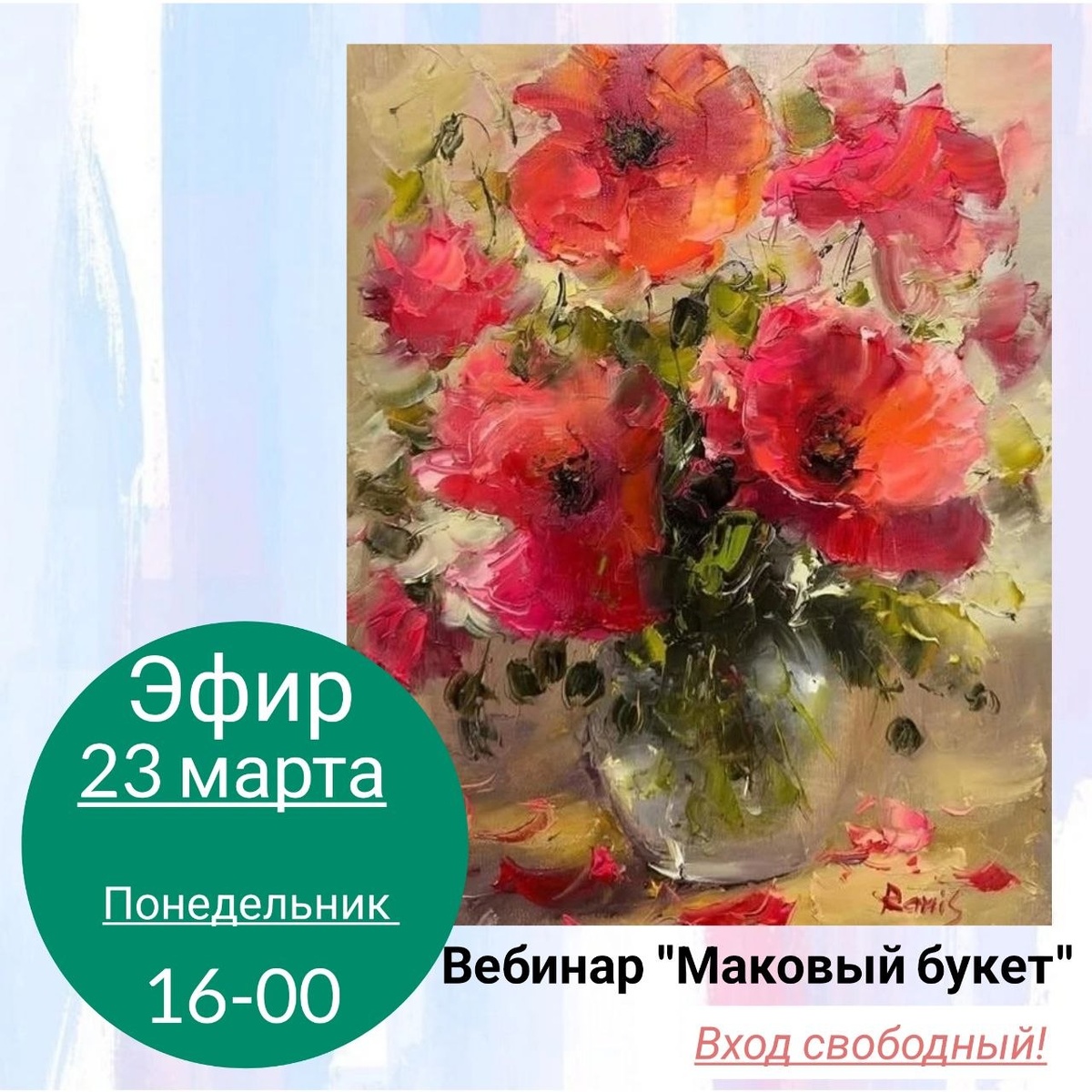 🎨 Ближайшие даты: ✅ 23 марта ПОНЕДЕЛЬНИК 16-00 Вебинар "Маковый букет" 🔹️Референс на яндекс диске https://disk.yandex.ru/i/slBEt2pr9JW3WA ✅ 25 марта СРЕДА 16-00 Вебинар "Разноцветье" 🔸️Референс на яндекс диске https://disk.yandex.ru/i/7Xn9JSuSsmLw8g ВХОД СВОБОДНЫЙ! ➡ Эфиры понедельника и среды будут доступны с 16-00 до 22-00 в день проведения. ➡️ После закрытия доступа видео можно купить со скидкой в нашем магазине https://risuem-doma.ru/videostore ➡Материалы: 🎨Краски масляные: 🔸️белила титановые 🔸️Краски масляные: - Кадмий желтый средний - Зеленая травяная - Краплак красный - Индиго - Умбра натуральный Ленинградская - Кобальт Фиолетовый - Охра желтая - Голубая фц 🔹рекомендованные холсты 30*40, 40*60, 40*50 🔹кисти: - кисть щетина строительная - Кисть синтетика круглая номер 1 и 4 - Кисть синтетика плоская номер 8 - Мастихин 🔹Разбавитель 🔹Тряпочка 🔹Губка 🔹Влажные салфетки