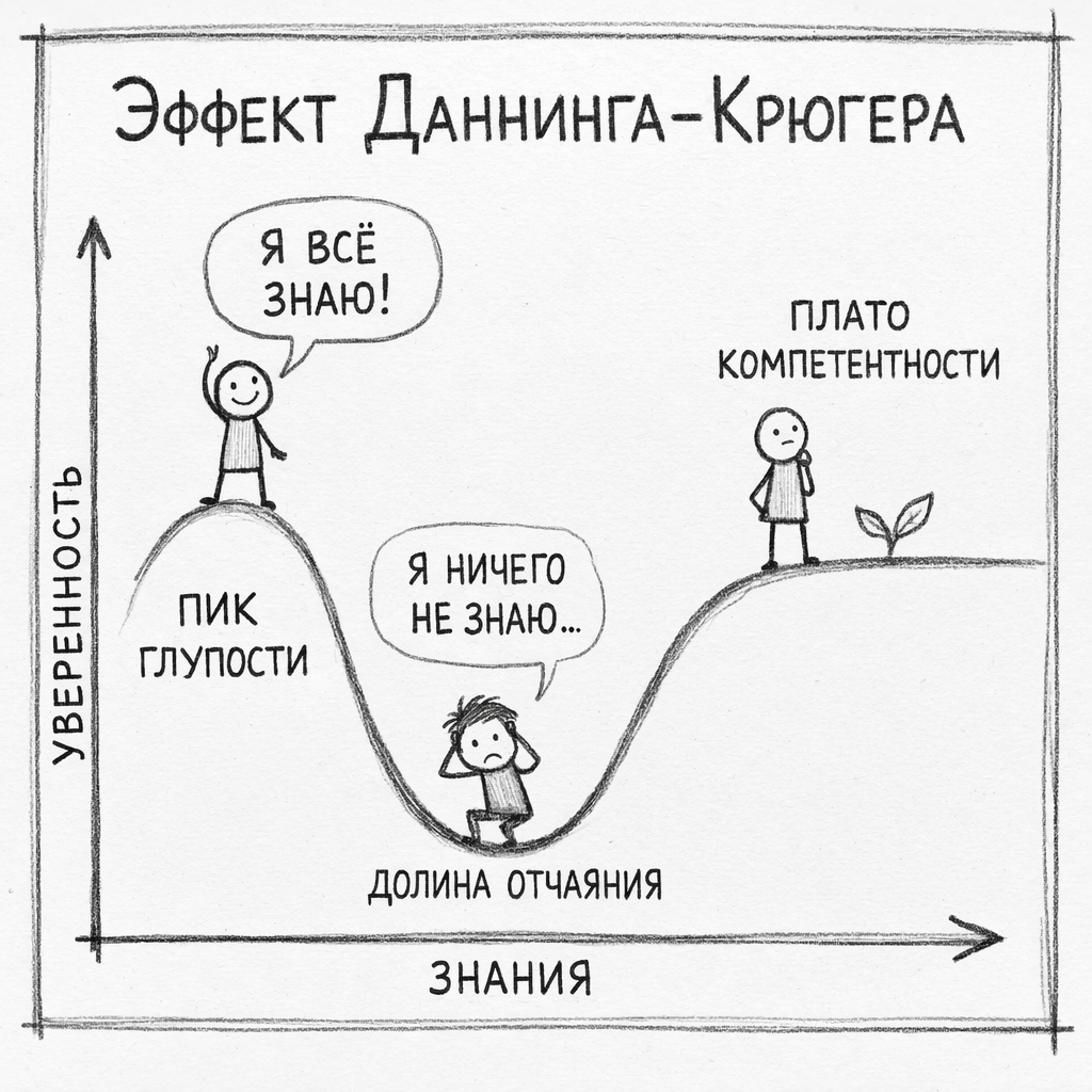 Эффект Даннинга–Крюгера Эффект Даннинга–Крюгера — когнитивное искажение, при котором человек с низкой компетентностью в какой-то области переоценивает свои знания. Причина проста: чтобы увидеть собственные ошибки, нужны те же навыки, которых как раз и не хватает. Этот эффект описали психологи Дэвид Даннинг и Джастин Крюгер в 1999 году. Как работает этот механизм Схема довольно типичная. Мало знаний → высокая уверенность Человек знает немного и чувствует, что «всё понятно».