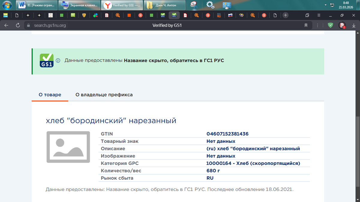 Есть доступ на земле в информационно-телекоммуникационную сеть Internet ("Интернет"), соответствующей поисковой системы (браузер) на страницы сайтов через World Wide Web (аббревиатура WWW (Всемирная Компьютерная Сеть). На территории Российской Федерации страница сайта: https://search.gs1ru.org/ есть «Поиск товара Поиск по глобальному номеру предмета торговли (GTIN)». Далее у меня есть купленный товар через штрихкод EAN-13 за цифровым значением 4607152381436, который хочу проверить. Далее в рабочее поле строки «Введите номер штрихкода (GTIN)» названного сайта ввожу настоящее цифровое значение, в связи с чем получаю следующее. Номер является действительным идентификатором GS1. О товаре хлеб "бородинский" нарезанный GTIN 04607152381436 Товарный знак Нет данных Описание (ru) хлеб "бородинский" нарезанный Изображение Нет данных Категория GPC 10000164 - Хлеб (скоропортящийся) Количество/вес 680 г Рынок сбыта RU Данные предоставлены: Название скрыто, обратитесь в ГС1 РУС. Последнее обновлени