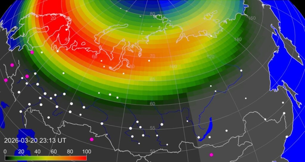 О начале магнитной бури в 01:32 21 марта сообщили в лаборатории солнечной астрономии Института космических исследований РАН. По словам ученых, магнитное поле Земли «держалось» до последнего, но в итоге возмущение все же перешло в бурю. Магнитное поле держалось сколько могло, но силы не беспредельны. На Земле через 20 часов после прихода плазменного облака всё же началась магнитная буря, — говорится в сообщении лаборатории. Параллельно специалисты фиксируют очень яркие полярные сияния — близкие к максимальным значениям. При этом, как отметили в лаборатории, наиболее интенсивное свечение уже заметно сместилось в сторону Европы, и наблюдателям в других регионах мог достаться лишь «край» аврорального овала. Также сотрудники лаборатории попросили тех, кто успел увидеть это явление, поделиться снимками. Если кто-то смог захватить «хвост» аврорального овала, то присылайте, пожалуйста, фотографии, — обратились ученые к подписчикам. Буря сопровождалась красочным полярным сиянием. Его видели жит