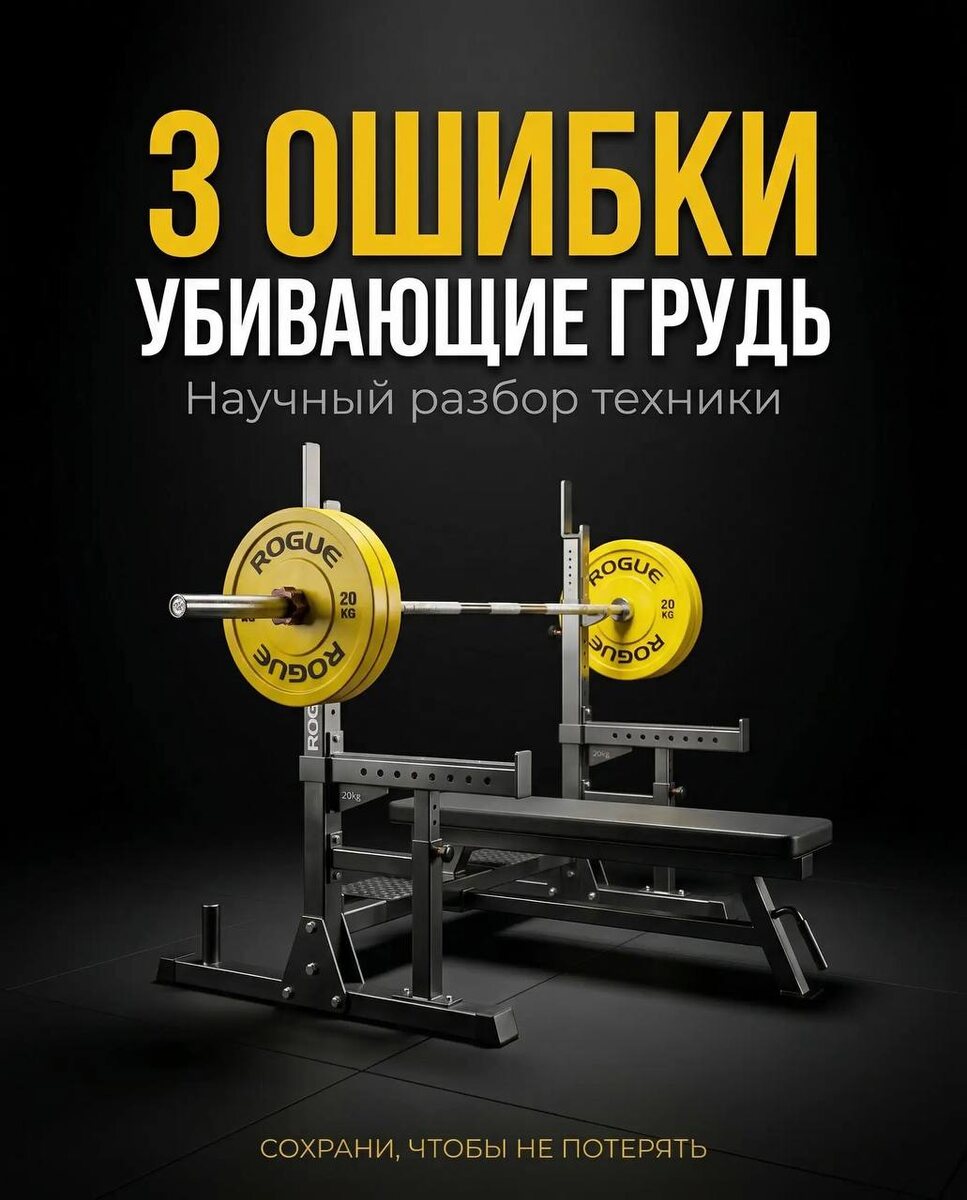 📌 Жим лёжа — это не просто «пожал и пошёл». Это техника, в которой 80% новичков делают ошибки и удивляются, почему грудь не растёт, а плечи болят. ✅ 3 главные ошибки (с визуалом, чтобы сразу было понятно): 1️⃣ Локти в стороны — плечевые суставы под нагрузкой, грудь работает вполсилы 2️⃣ Отрыв таза — включается поясница, грудь выключается 3️⃣ Неполная амплитуда — мышцы не растягиваются, нет оптимальной растянутой позиции = нет роста 💯 И в конце — оптимальная техника (сохраняй и применяй): ✅ Локти 45° ✅ Таз прижат ✅ Гриф касается груди