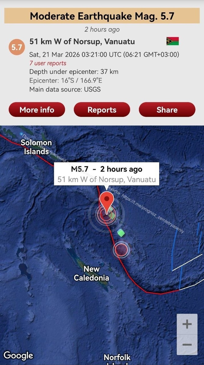 Прогнозная зона у Вануату добавила еще одно ощутимое землетрясение М5.7