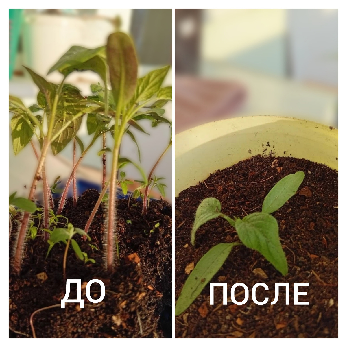 Результат: Растение замирает в росте на 7–10 дней. Пока томат восстанавливает корень и пускает боковые отростки «мочалкой» по всему литровому объему, стебель не тянется. Мы выигрываем время и получаем мощный, коренастый саженец.