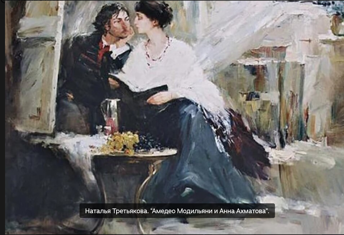 Хотя я тут и выставила картину Натальи Третьяковой, изображающую Амедео Модильяни и Анну Ахматову, демонстрирующих явный взаимный интерес, на самом деле, говоря о любимой женщине Модильяни, я имею в виду отнюдь не Анну. Да, художник и поэтесса были знакомы и общались в Париже, куда Ахматова и Гумилев приехали после своей свадьбы. Да, Модильяни рисовал Ахматову с несомненной нежностью в каждой линии рисунка, да, она вспоминала потом его тоже весьма нежно. Но, даже если между ними что-то и было во время тех парижских встреч, это была мимолетная влюбленность и недолгое взаимное притяжение, скорее всего, чисто платоническое, учитывая тот факт, что Ахматова была новобрачной. Так что, я не думаю, что между Ахматовой и Модильяни был какой-то роман. Флирт — вполне. Дружба двух творческих личностей — несомненно. Но не глубокие страстные чувства и любовная связь. Неистовая любовь, воистину трагическая, связала художника с другой женщиной. Это была 19-летняя Жанна Эбютерн. Она была студенткой А