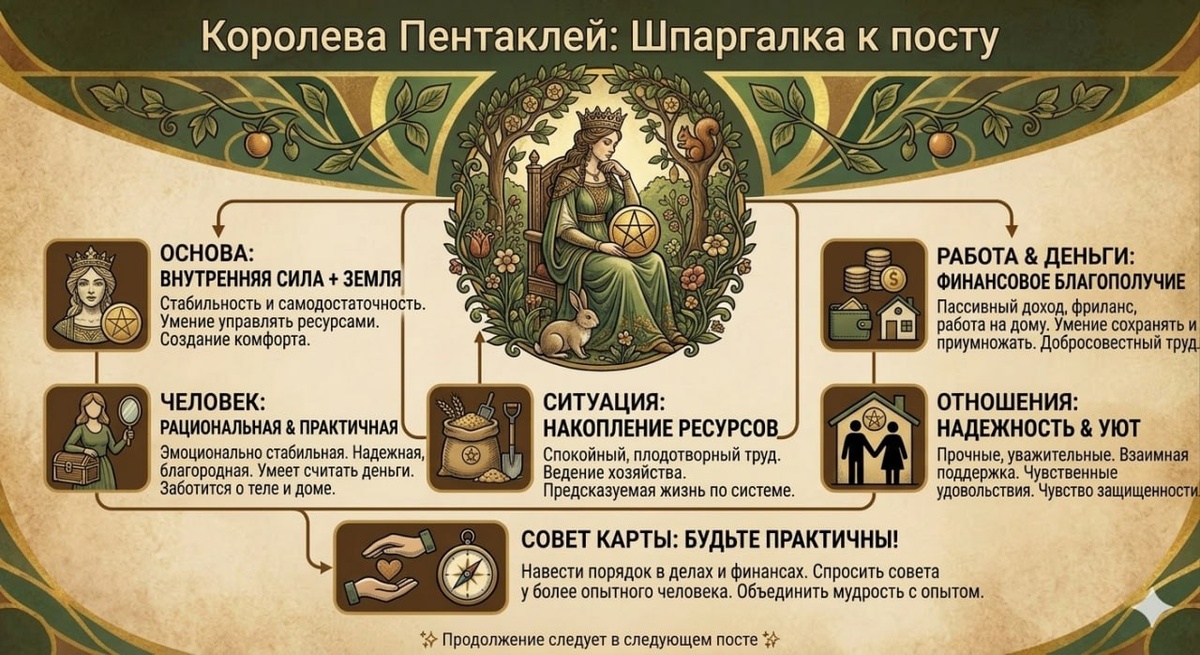 Королева Пентаклей Продолжаем наши разборы придворных карт! Мы завершили цикл Рыцарей и сегодня открываем новую главу — погружаемся в глубокую, созидательную энергию Королев. И начнем мы с самой основательной, «земной» и изобильной героини — Королевы Пентаклей. Это карта зрелости, накопления и абсолютного баланса. Основа карты Королева — это внутренняя сила, сохранение, управление и зрелость. Пентакли — стихия Земли: материальный мир, ресурсы, тело, дом и плоды нашего труда. Если соединить эти значения, получается формула: стабильность и самодостаточность, достигнутые через разумный труд. Это не про быстрый рывок и не про воздушные замки. Это про умение прочно стоять на ногах, создавать вокруг себя комфорт и наслаждаться результатами своих усилий. Королева Пентаклей точно знает: чтобы сад расцвел, за ним нужно ухаживать ежедневно. Если карта показывает человека Королева Пентаклей — это воплощение рациональности и эмоциональной стабильности. Она благородна, надежна и свободна в св