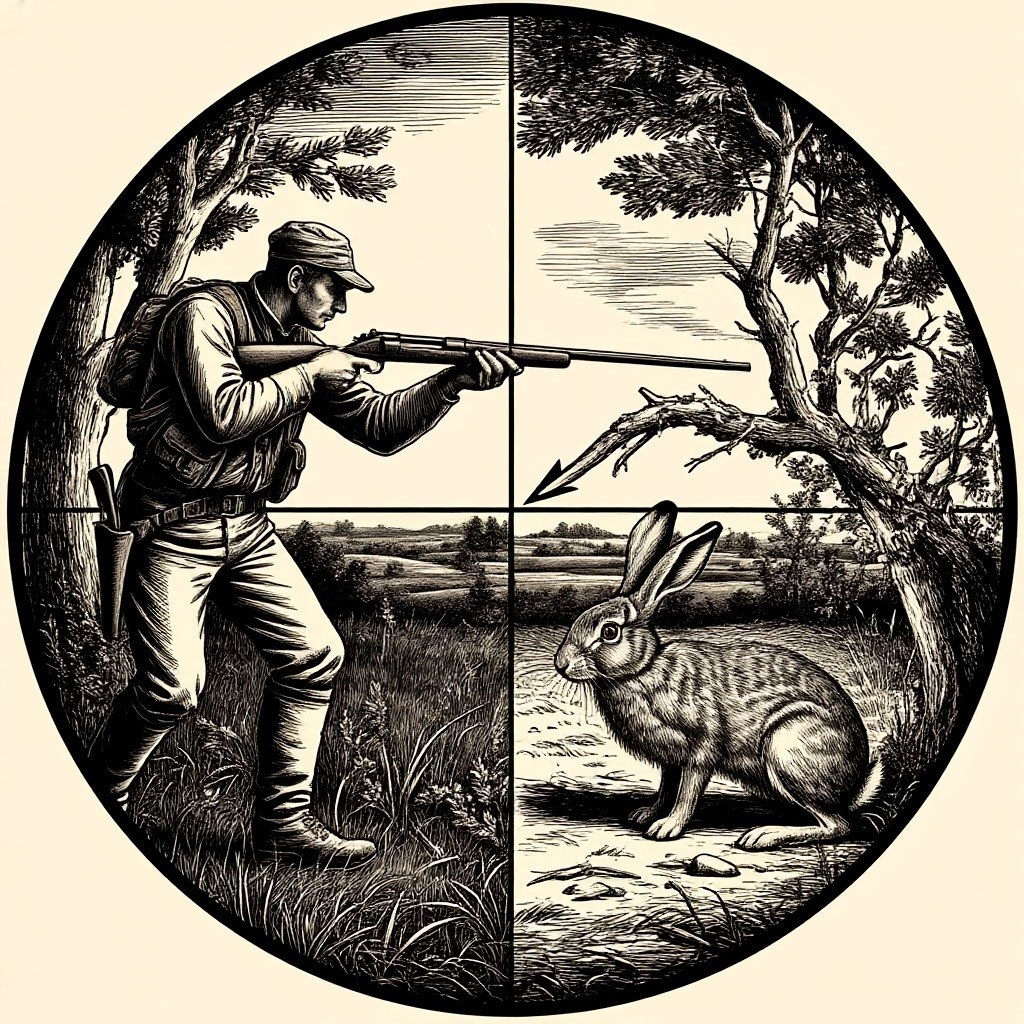 Охотник замер. Потом медленно выпрямился, посмотрел на зайца внимательно — так, будто увидел что‑то знакомое.