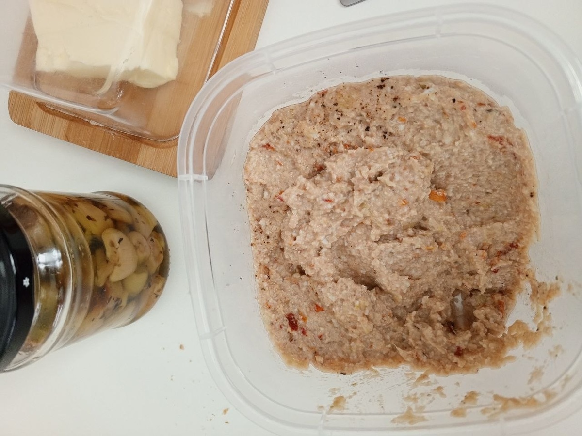 Куриное мясо готовое (отварное, запечённое), варёные яйца, томаты, соль, перец, чеснок немного, лук обжарить на сливочном масле, чуть сахара добавить для баланса, зелень. На блендере в пюре. В теплом виде очень вкусно, но не стабильно. А вот когда остынет, то отлично держит форму. Рекомендую. Готовьте с удовольствием! #готовимдомавкусно #паштет #перекус #завтрак #курица #вяленые_томаты #яйца #зелень #лук_жареный