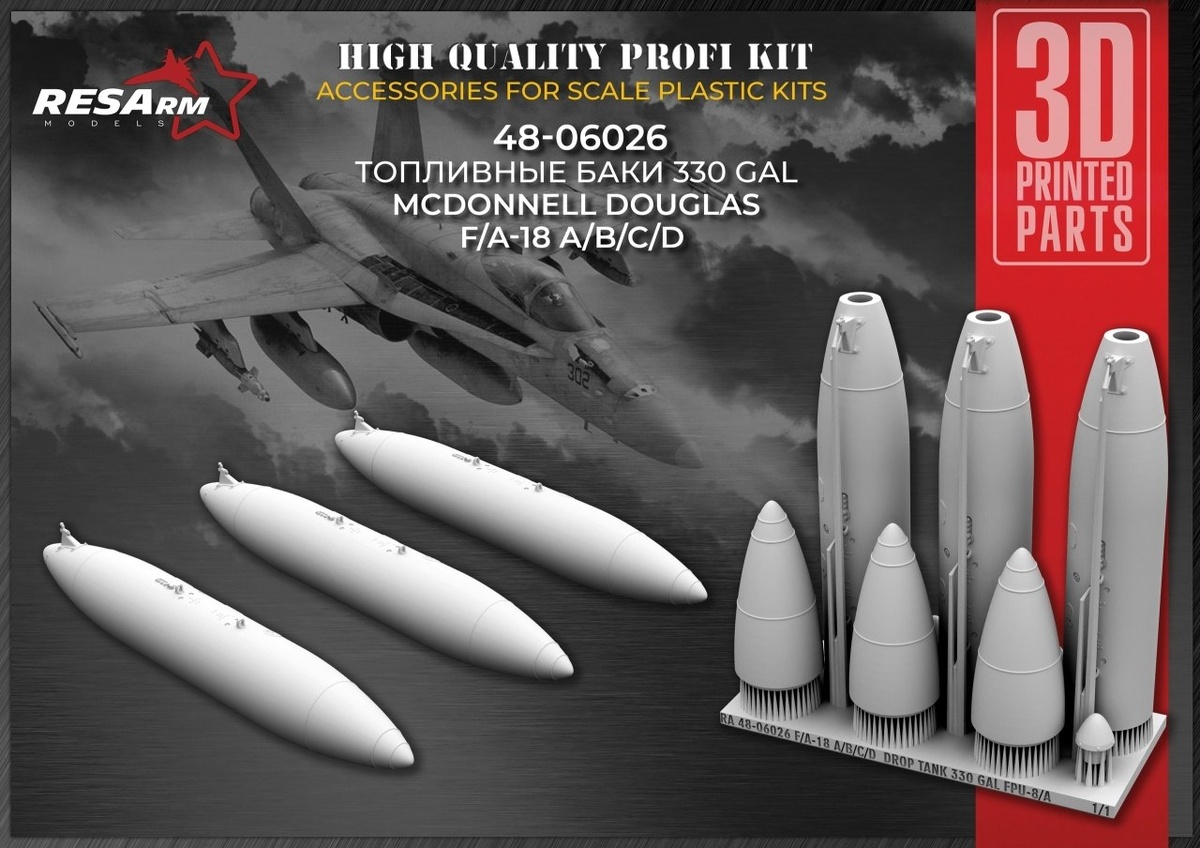 Волгоградская RESArm выпустила на 3D-принтере комплект подвесных топливных баков на 330 gal для моделей самолетов F/A-18 A/B/C/D в масштабе 1/48.
