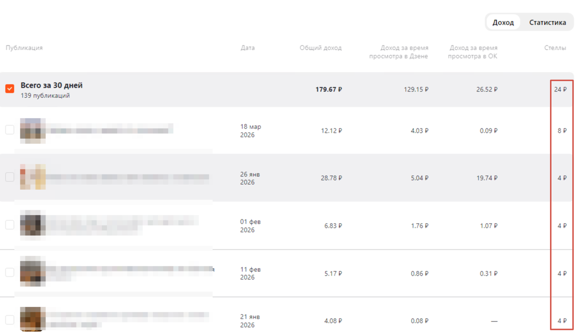 Хочу подвести промежуточные итоги наблюдения о том, как работают стеллы на платформе Дзен. Я говорил ранее, что меня интересует только вопрос влияния стелл на рекомендательные алгоритмы Дзена. Итоги неутешительные. Основное что хочу отметить - всё же на статьях, которые получили стеллы, есть рост показов. Существенный. Напомню, что стеллы я купил и потратил на свои каналы, чтобы проверить их в действии. Так вот, на третий день показы статей со стеллами здорово увеличились. Примерно в три раза от обычных средних по каналу. НО это касается только моих немонетизированных каналов. И стеллы, потраченные на них ушли полностью в доход Дзена. На монетизированном канале рост показов не был отмечен. И слава богу. Ниже расскажу почему. Отсюда вывод: стеллы не продвигают монетизируемые каналы. Потому что платформе это не выгодно. С каждой стеллы, потраченной на монетизируемом канале, мне вернулось 4 рубля (скрин ниже) Итого с 6 стелл пришло 24 рубля. Напомню, что я там зарегистрирован как самозаня