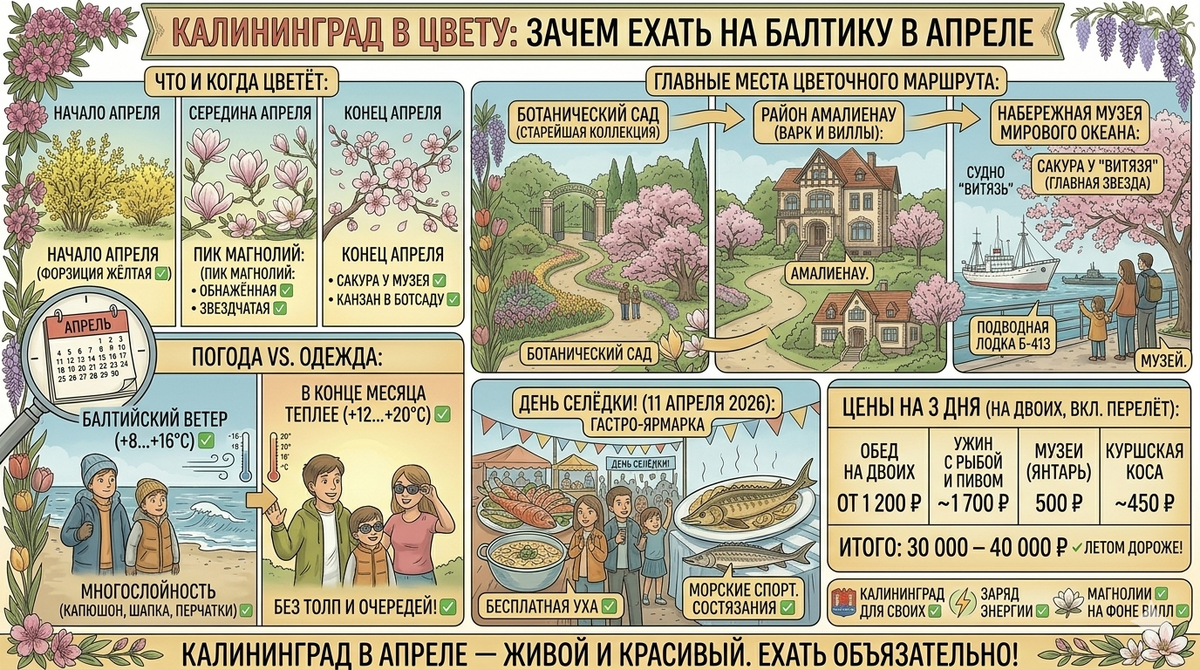 Если вам нужен пляж — нет, вода в апреле около +6°C, купаться нельзя. Если вы хотите увидеть город живым, красивым и без толп — однозначно да. Калининград в апреле — это магнолии на фоне немецких вилл, запах моря, звон трамваев и ощущение, что вы где-то между Россией и Европой. Это ощущение трудно описать — его нужно просто поймать.