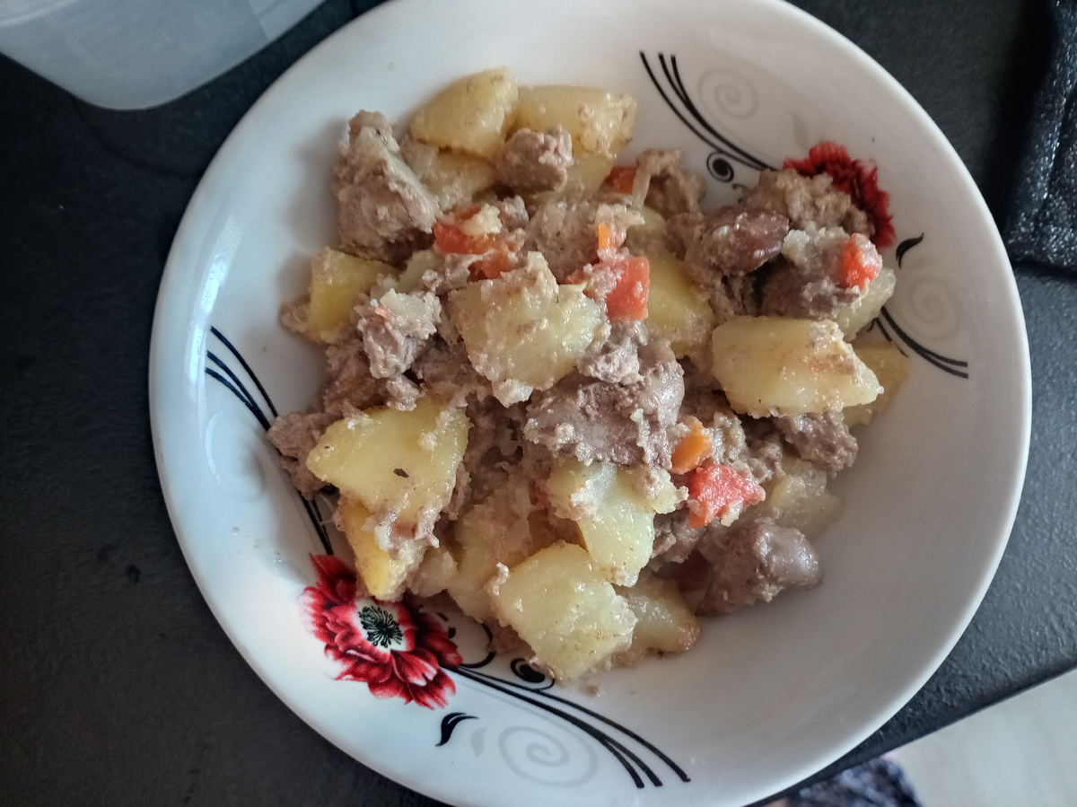 Достала четыре картошки, брусок замороженной куриной печени. Промыла печень, чтобы не было крови, порезала на небольшие квадратики, но и не сильно маленькие. И вместе с порезанной картошкой закинула их в сковородку, туда же лук, чеснок, морковь, а масла положила топлёного несколько комочков и немного растительного, начала