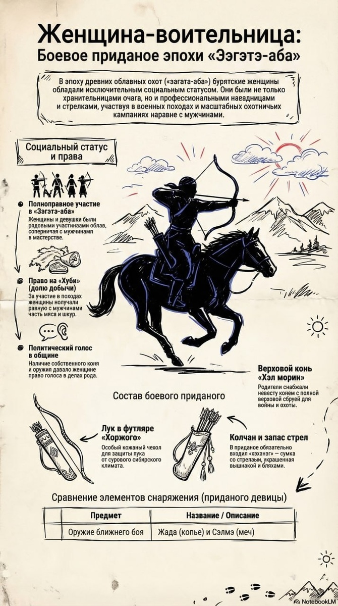 В эпоху древних облавных охот бурятские женщины обладали исключительным социальным статусом. Они были не только хранительницами очага, но и профессиональными наездницами и стрелками, участвуя в походах наравне с мужчинами. Социальные права: Женщины были полноправными участницами «Зэгэтэ-аба», соперничая с мужчинами в мастерстве. За участие в облавах они получали равную долю добычи (Хуби) — мясо и шкуры. Наличие собственного коня и оружия давало женщине право голоса в делах общины и рода. Состав боевого приданого: В состав обязательного снаряжения невесты входил верховой конь «Хэл морин» с полной сбруей, лук в кожаном футляре «Хоржого» и колчан со стрелами «Хэхэнэг». Также комплект дополняло холодное оружие: копье (жада) и меч (сэлмэ). Канал нашей студии https://dzen.ru/id/670c7fe545d6d72caa724e37