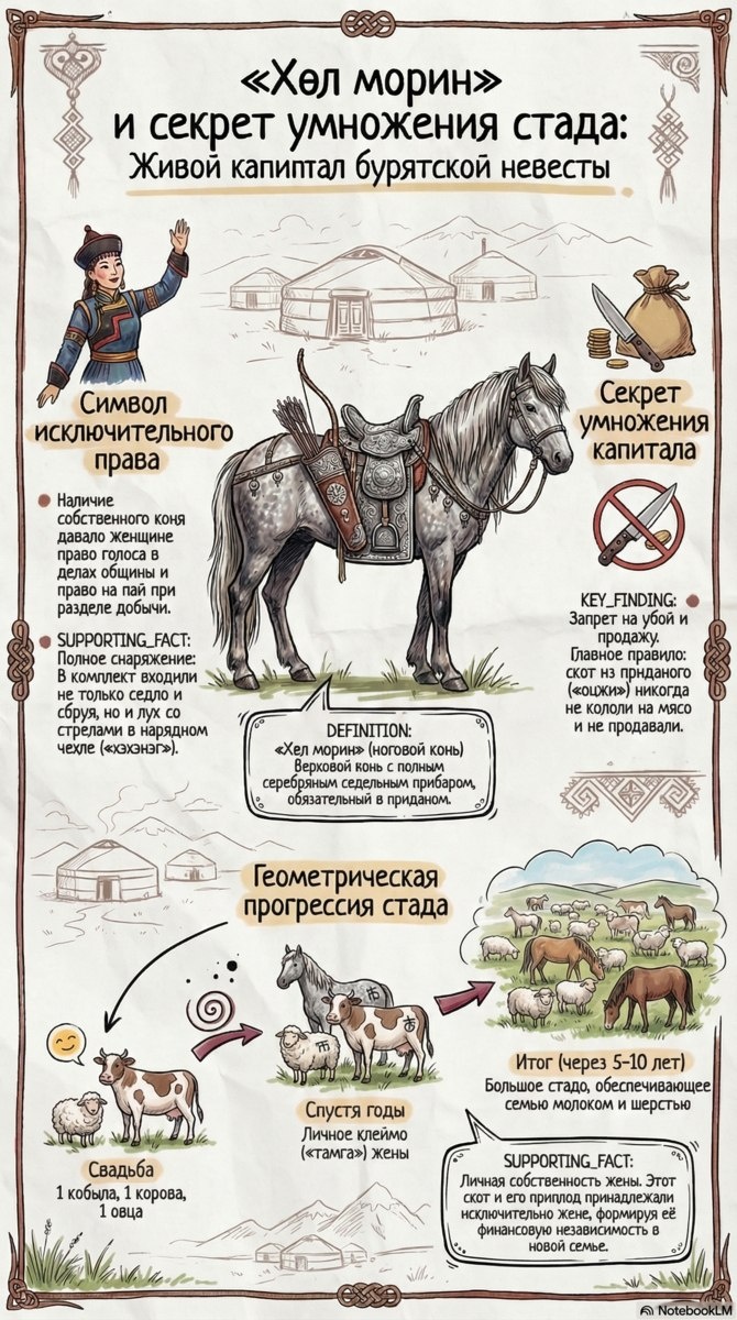 «Хэл морин» — верховой конь с полным серебряным прибором, являвшийся обязательной частью приданого и живым капиталом невесты. Финансовая независимость: Скот из приданого (онжи) составлял личную собственность жены. Главное правило гласило: этих животных никогда не кололи на мясо и не продавали. Благодаря этому запрету через 5-10 лет стадо увеличивалось в геометрической прогрессии, обеспечивая семью молоком и шерстью. Личное клеймо: На скот, полученный от родителей, женщина ставила собственное клеймо (тамга). Это формировало полную экономическую защищенность женщины в новой семье, так как муж не имел права распоряжаться этим имуществом. Канал нашей студии https://t.me/chimitdorzhi_studio