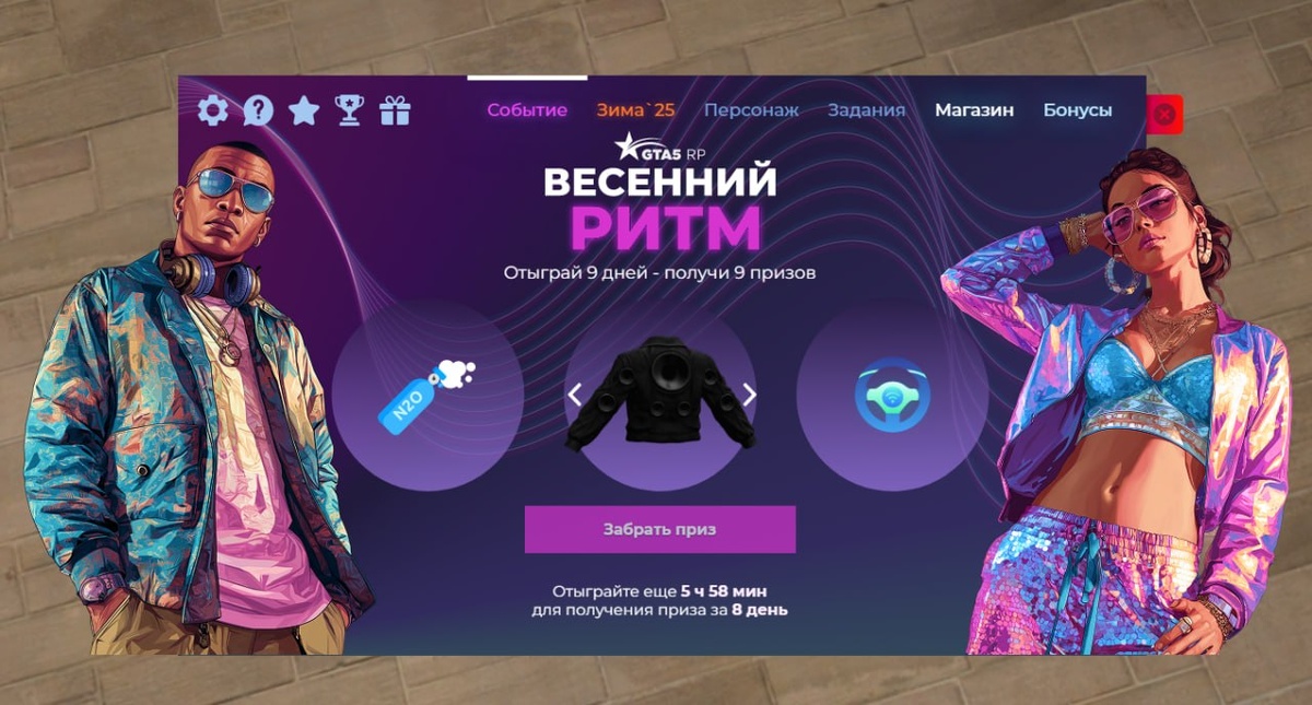За восьмой день ивента «Весенний ритм» на GTA 5 RolePlay можно получить закись азота ИЛИ комплект для установки автопилота ИЛИ куртку бумбокс(?).