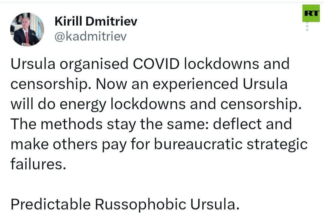 'ENERGY LOCKDOWNS' incoming, COVID style — Putin's envoy Dmitriev warns of methods wielded by a 'predictable' Ursula von der Leyen