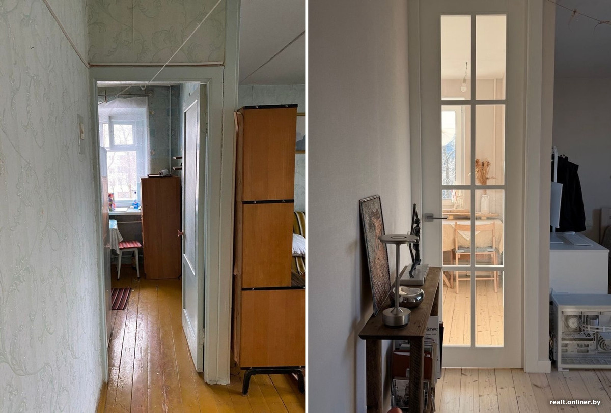 Продолжаем публиковать истории в рамках конкурса «Большая переделка. 2-й тур». Вместе с нашим партнером — торговым центром «Ленинград» — разыгрываем 1000 рублей среди читателей, которые делятся опытом ремонта старого жилья. В этом выпуске свою историю рассказывают Никита и Александра. Они купили однокомнатную квартиру в доме 1960-х годов и превратили ее в светлое и продуманное пространство с характером, сохранив деревянный пол, оставив хрущевское окно в ванной и собрав интерьер из деталей, сделанных своими руками. А если вы тоже хотите поучаствовать в конкурсе, присылайте свои тексты и фото на почту daa@onliner.by. Все условия читайте здесь.